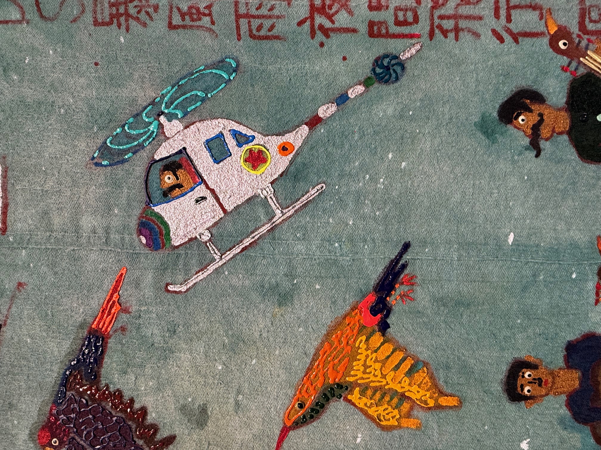 The men in and around the Armory Show have numerous takes on love, including painful reminders of loveless lives. Doowon Lee’s Birds on a Stormy Night (mixed media on wool, 80 x 63 inches, courtesy ACA Galleries, NYC) shows a range of individually shaped and colored birds trying to fly as helicopters and war planes clog the air space; in one corner, a three-piece male band stands on a prone turtle’s back as a frog and a bird look on. The colors, lines, and movement in this work make it the one I would buy! The (all male?) birds and band are metaphors for upbeat, individualized spirits trying to survive threatening times. This is one of several exquisite, affordable paintings and tapestries by Doowon Lee, a self-taught Korean artist born in 1982 and based in Seoul (https://acagalleries.com).