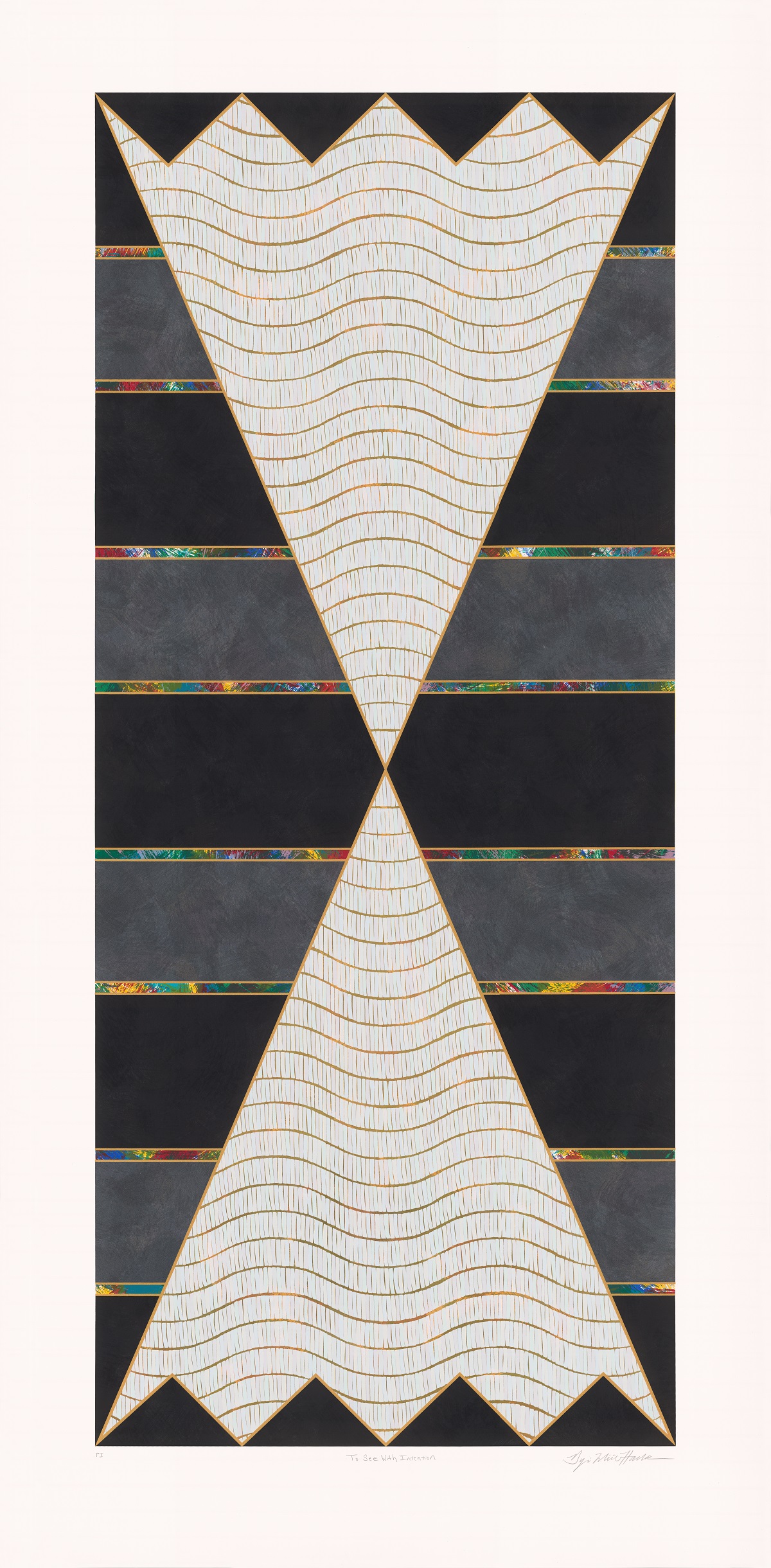 Dyani White Hawk’s screen prints place Lakota symbols in the foreground to honor the historic importance of Indigenous cultures in the world. To See With Intention, 2024 (Tandem Press, Edition of 24, 58 x 28 ½ inches) (www.tandempress.wisc.edu) is sold out, but this mixed-heritage artist’s Lakota hourglass form, called kapemni, also appears in other print works and in ceramic work on one wall at the Whitney Museum. White Hawk often includes beadwork or quillwork in her paintings and mixed media works. As an artist of Lakota, German, and Welsh heritages, she draws on Euro-American and Lakota traditions. Her philosophical titles, such as To See With Intention and Intersections, and her symbols unite all genders and heritages. White Hawk was born in 1976 in Madison, Wisconsin (www.dyaniwhitehawk.com)