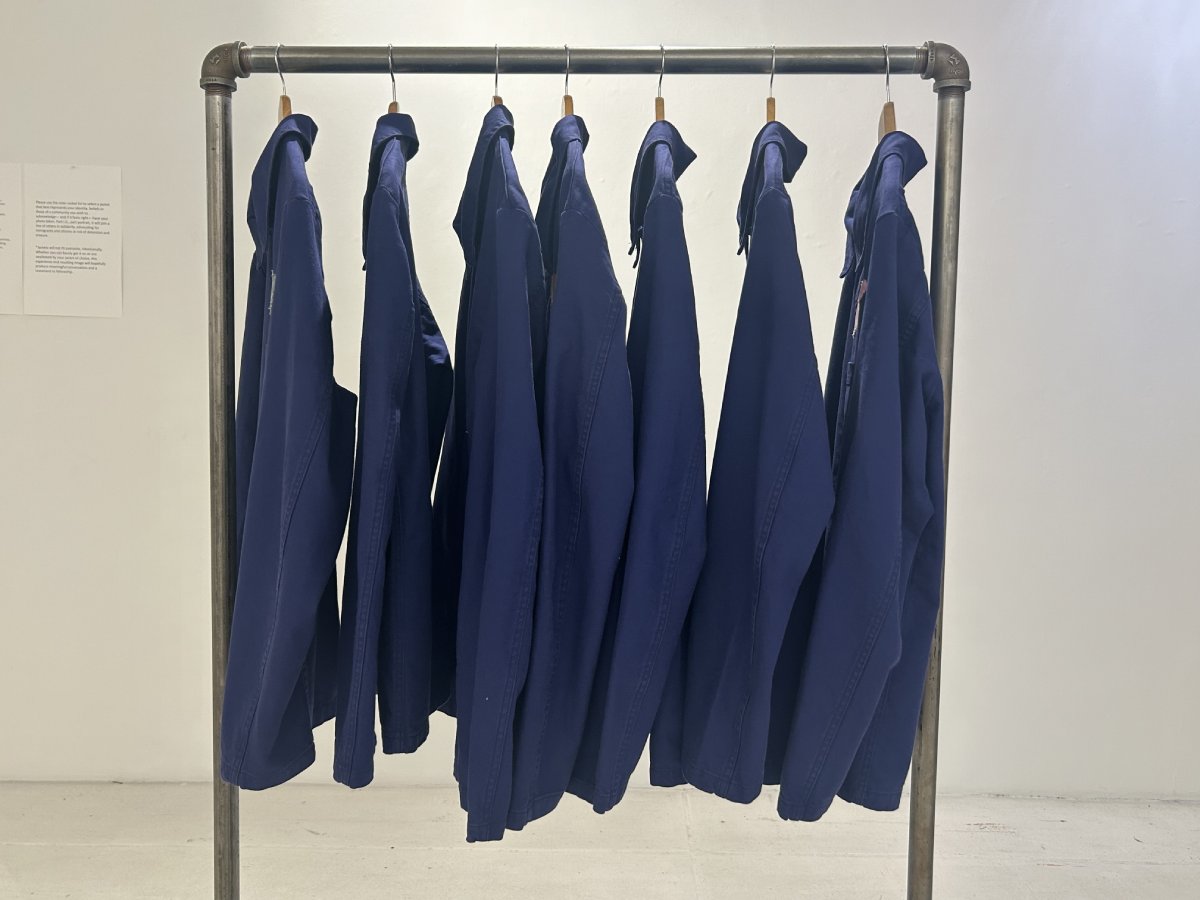 In addition to the triangles on the walls, there’s a rack of prisoner jackets with affiliations to a World War II garment manufacturer. Gallery visitors can try on these jackets to have their Polaroid pictures taken and pinned to the wall.