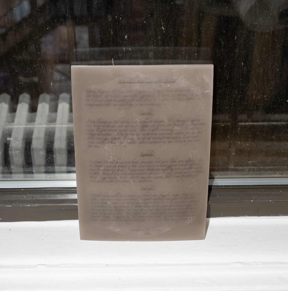Rejection also occurs in more personal and abstract forms. 29:51 (8 or 4 or 5 years later) by Sixing Xu is inspired by the abrupt end of a friendship, which is represented by a copper plate split down the middle with no hope for a full reconciliation. Bureau of Cloud Management-Nephophile by Alternative Systems rejects the moronic assumption that AI is always correct and logical, choosing to prioritize a more flawed yet humanistic way to make sense of the world surrounding us. Jiaoyang Li’s Kite, a Kite hovers only a few inches off the ground, rather than soaring freely in the sky. This suppression is emphasized by the use of pink ink on pink paper, further concealing Li’s poetry and forcing readers to kneel in order to engage with her artwork. Similarly, Untitled (Nonfiction) by Wei is a challenging reading experience. Wei’s letter to their family is partially obscured by the wax medium and the illegible font, effectively hindering communication. The audience is only able to glean a few bits of information, which mirrors Wei’s experience as a queer individual who is unable to fully express their situation to their parents, who don’t speak fluent English.