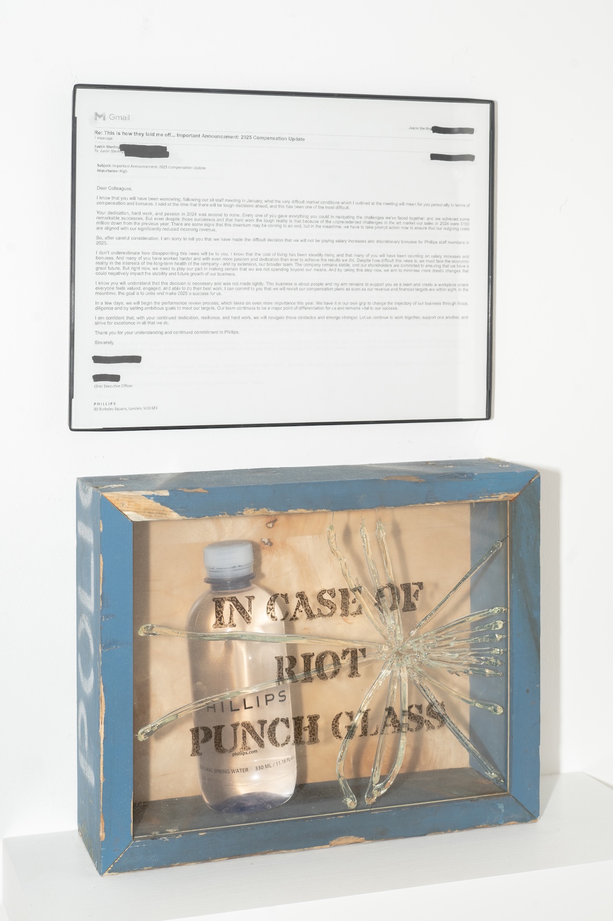 In this exhibit, the rejection letter acts as both the subject matter and the medium. Yuhan Pan’s Certificate of Achievement humorously turns the tables by writing feedback directly onto printed copies of rejection emails she has received. She criticizes the overreliance on automated templates and keywords, highlighting the lack of emotional sincerity to be found in these devastating rejections. Justin Sterling responds to a layoff email he had received from his former employer with Riot Box (Phillips), in which he places the complementary branded water bottle often offered to the auction house’s rich patrons inside a shattered glass case, thus utilizing his art practice as a means of catharsis.