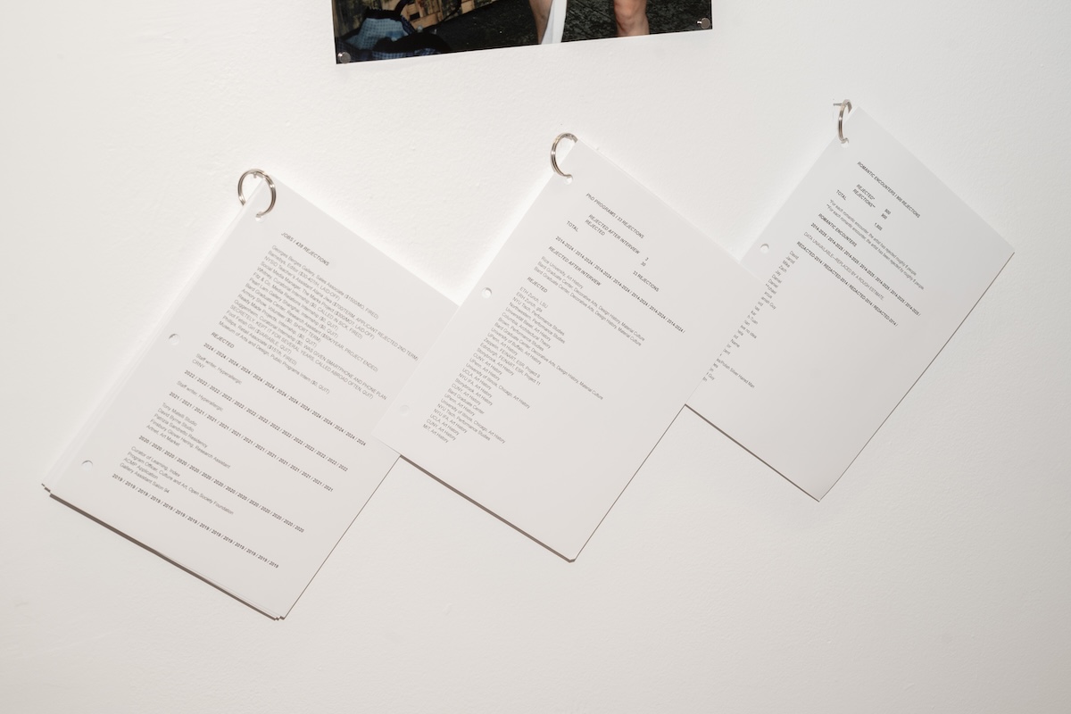 I was unsure if I wanted to laugh or cry while I flipped through Anna Mikaela Ekstrand’s Rejection is a Pain, But Not the Greatest Pain: a meticulous record of every professional (438), academic (33), and romantic (900) rejection that the artist experienced between 2011 and 2025. Above is a Hannah Arendt quote declaring, “pain is [...] the most private and least communicable [feeling] of all.” I thought about my own list of painful rejections, and all the cover letters for failed job applications I’ve hidden away deep within my Google Drive. In Wrung Way, Jie Shao evokes a similar impulse of wanting to put anything anxiety-inducing out of sight and out of mind. Inside a half-opened drawer, a crumpled golden letter lays on top of mulch spray-painted to resemble a race track, illustrating the conundrum of wanting to forget about the stress of rejection, yet still being forced to participate in the competitive process of submitting applications.