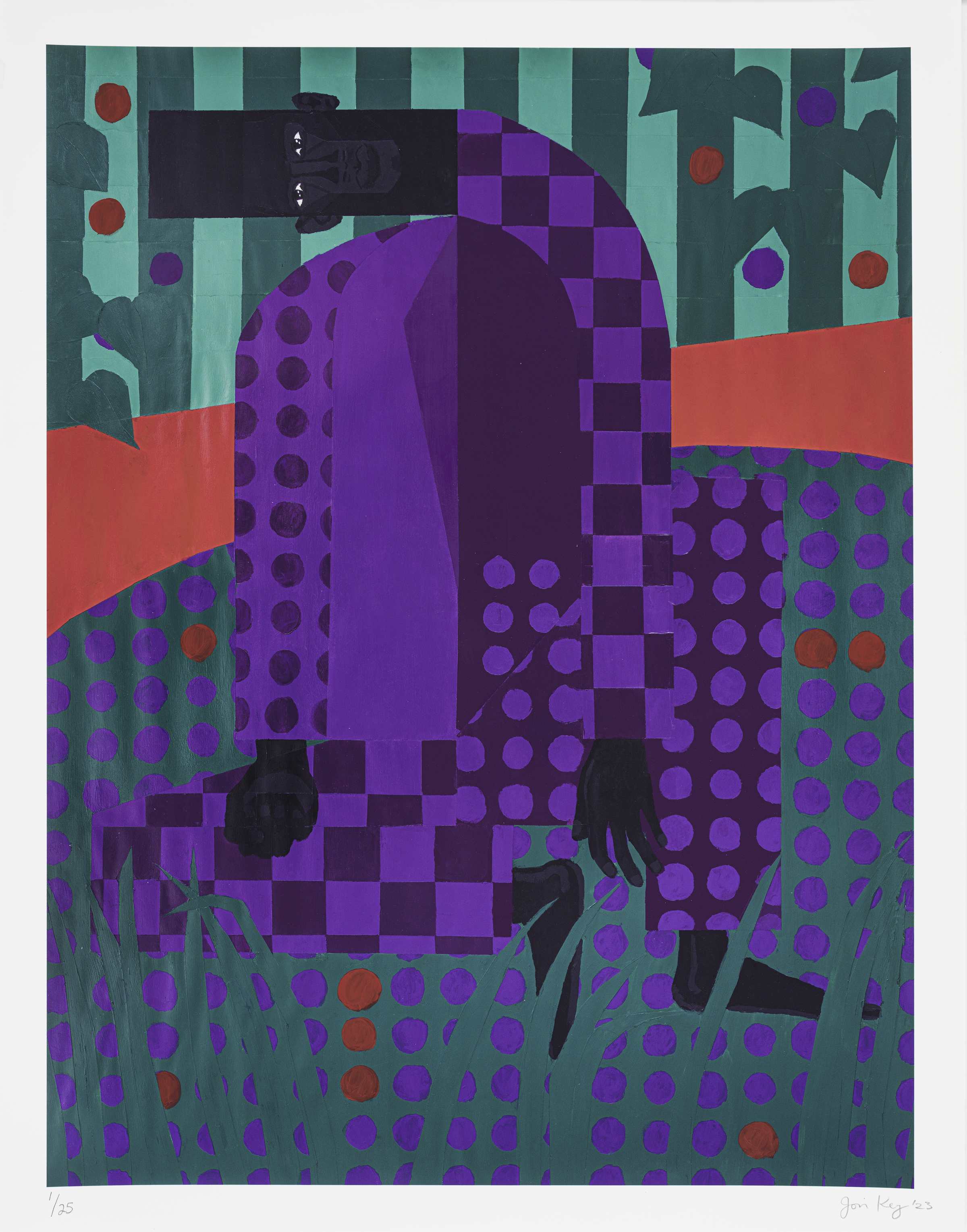 The Park of Dreams project showcases new contemporary art that focuses on the wondrous worlds and divergent walks of park life. Jon Key’s Man in the Violet Dreamscape No. 5, 2019, presents the central figure of a serene Black man, wrapped in purple geometrically patterned apparel that at once contrasts with the flourishing verdant vegetation and grass blades that sprout beneath him, but also reiterates what looks like symbolic fruits of the surrounding landscape keyed to some of the same shapes and colors. I especially love how this monkish man looks over to his right—out to the beyond—with his long neck craned like the bent branch of a tree to which he is greatly attuned. It seems as if he were destined for his seat in the woods, grown from the ground like the plant life around him.