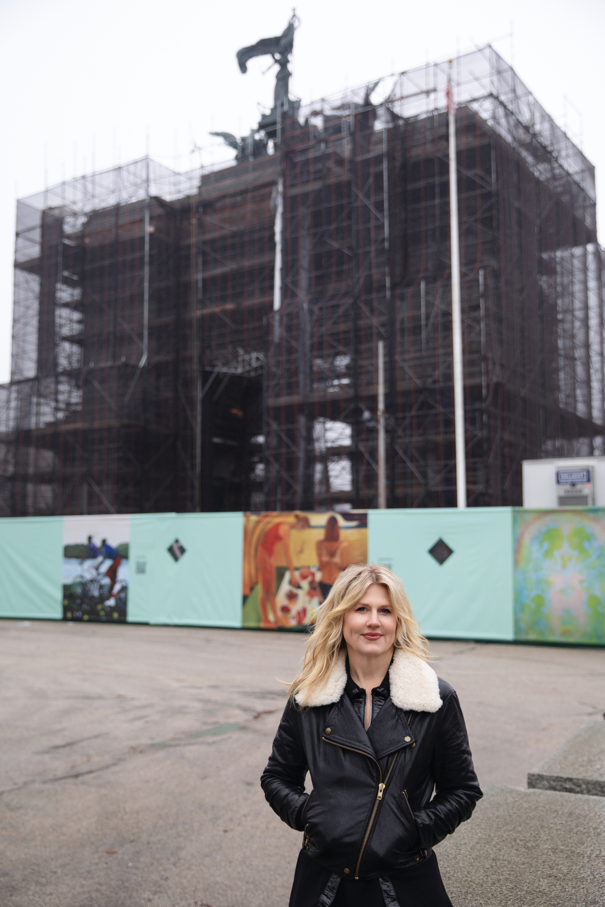 Founder Jeanne Masel of ART FOR CHANGE in front of the Park of Dreams banner at Soldiers’ and Sailors’ Arch in Brooklyn’s Grand Army Plaza. Photo by Javier Romero.