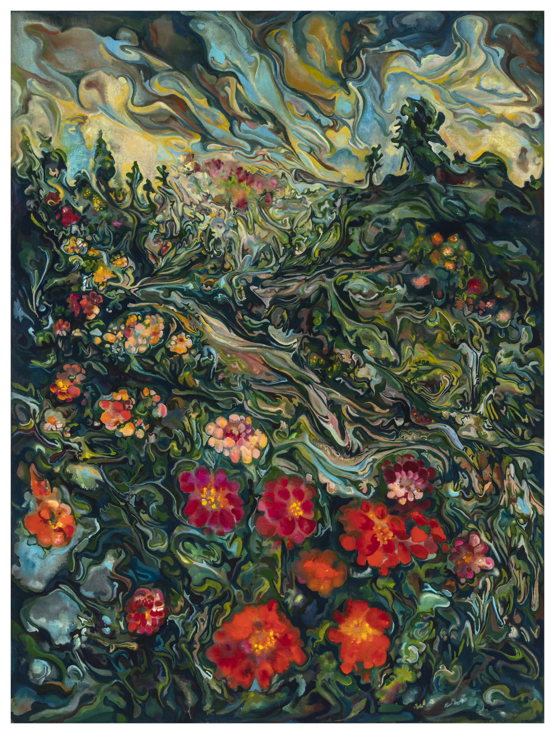 Maria Calandra, Time of the Zinnia, 2023, Acrylic on linen, 60 x 45 inches