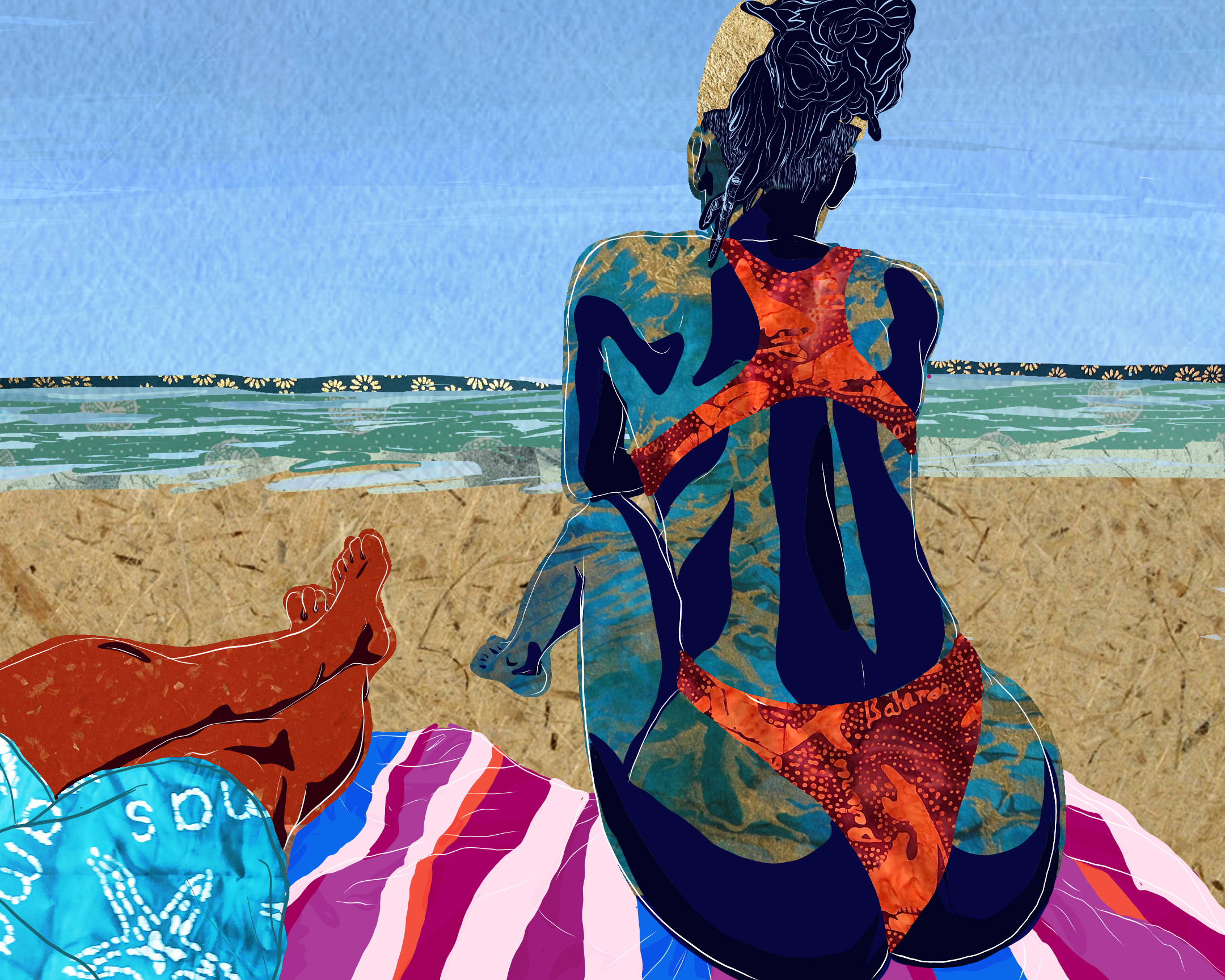 A lovely, refreshing work in this public presentation is that of Cydne Jasmin Coleby, entitled Remembering II, 2020. The central bikini-clad female figure in this collage sits on a beach towel, looks out across a lake and takes in a moment of peace. Her body, like Key’s Man—similarly coordinated in form and color to her surroundings—shows us an inherent connection to the nature nearby. The eye-bouncing contrast of textures—from a dimpled, heavyweight, watercolor paper sky and unbleached rag-as-sandscape to the many marbleized, decorative swirls of skin we see—gives extra life to this otherwise reflective scene for the figures in it.