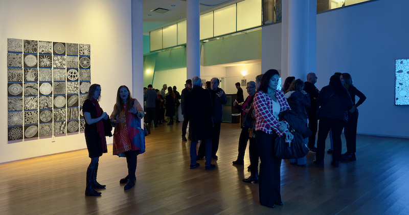 We had just explored her “Structural” series of 42 reflective white on black drawings presented as a single installation behind us. Six across, seven down squares, about a foot across, beautifully and intricately done with an oil pen, each featuring a different magnified microscopic image of matter that interests her; drawings of (mostly) organic things that that intrigue her before she has seen them through a microscope: plankton, parts of the human body (like neurons), celery, carrots, basil, other critters, plant roots, and stems. There are also four blowups of steel that re-“surface” in enlargements elsewhere in the show. In both cases she is interested in drilling down, looking under the rug, under our skin, as it were, beneath surfaces, to other levels.