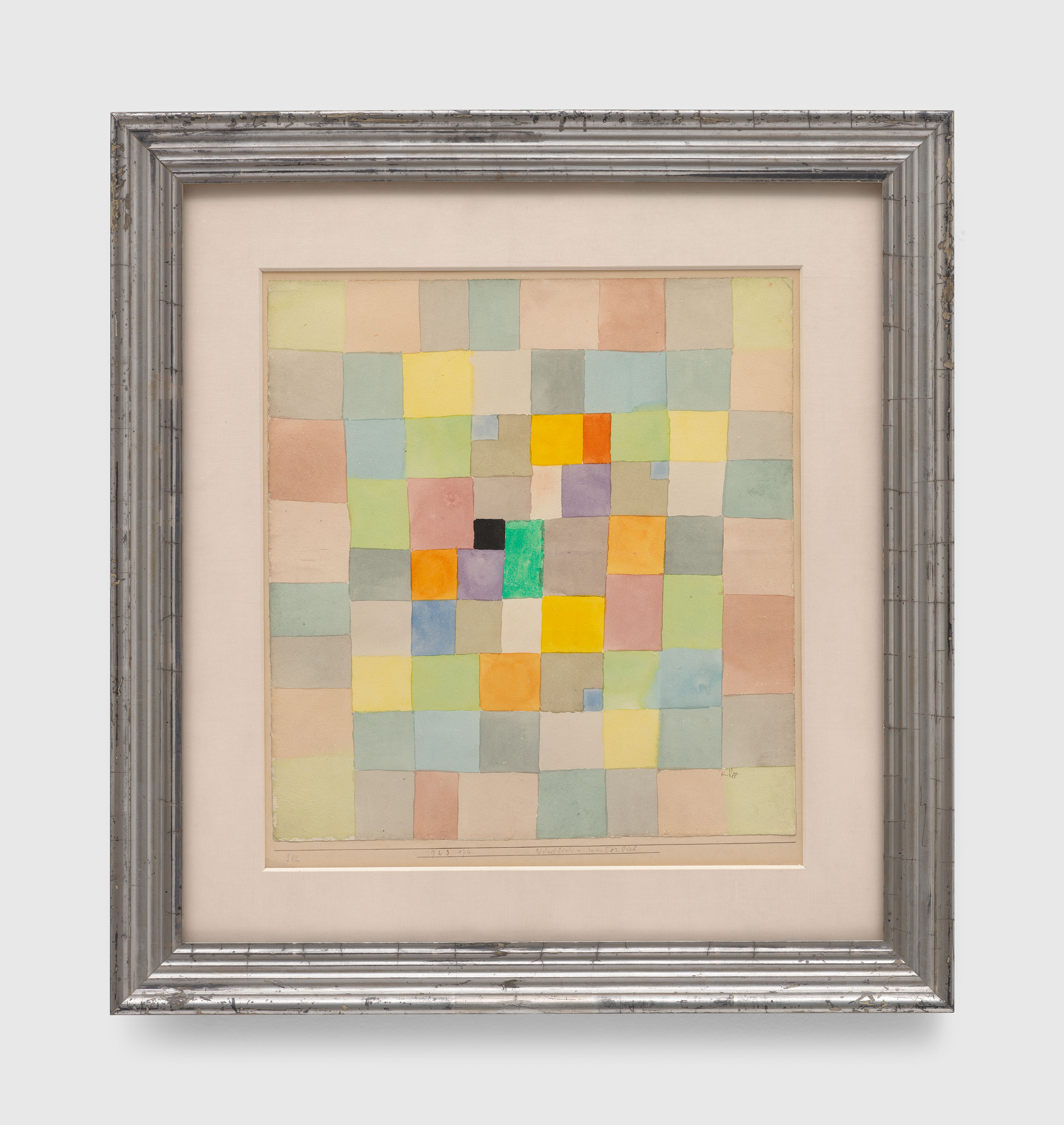 Nicholas Fox Weber, who curated Affinities: Anni Albers, Josef Albers, Paul Klee assembled a remarkable selection from the production of these three figures, situating their respective practices within a dynamic interplay of structure, intuition, and chromatic experimentation. Anni Albers’ textiles, distinguished by their geometric rigor and material ingenuity, conversed with Josef Albers’ systematic investigations of color relativity and spatial perception. Anni Albers’ woven compositions, look especially fresh given the recent popularity of fabric arts. They reflect a synthesis of fine craftsmanship and modernist formalism, reinforcing the Bauhaus preference for unity between art and design. In contrast, Josef Albers’ explorations into color perception and visual relativity feel like a personal voyage into how we see and understand color by carefully balancing rational composition and chromatic variation. When faced with Albers’ Grid Mounted (1921-1922) for example, we can’t help but feel a musical undertow of fluctuating color and optical modulation.