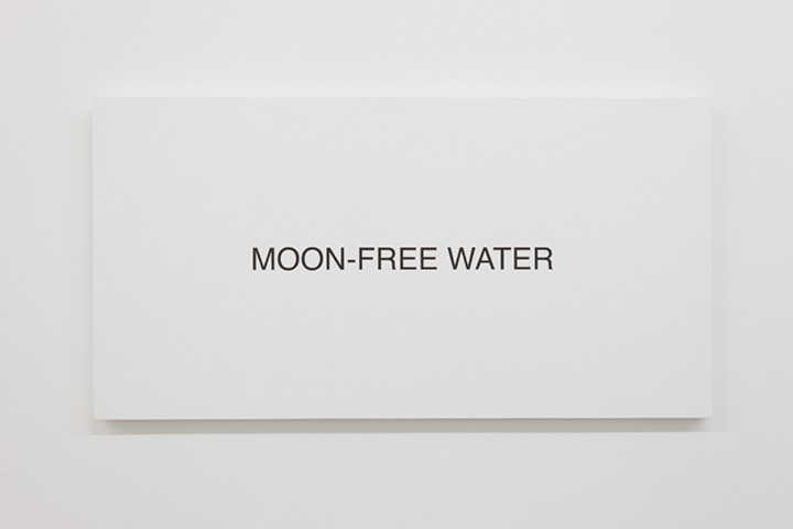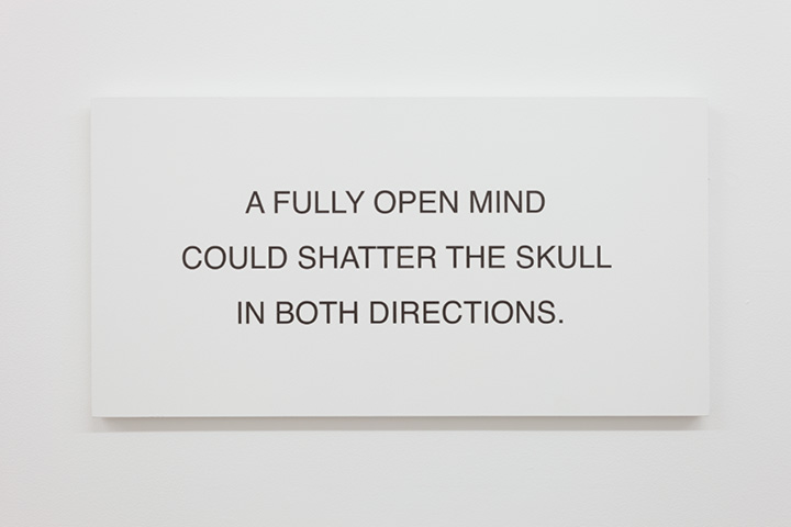 Out of the 68 works, chosen for display (all UV inkjet prints painted on MDF, measuring 14.5 x 28 x .75 inches) and rotated in groups of 12, the show becomes an on-going, omnipresent affair, full of surprise conjugations that perpetually refuse to conjugate in relation to one another. On one occasion there was an “accidental” triadic relationship between the corner of two walls and the ceiling where FIGHT PORCELAIN NOW and RAPE THE STEAK appear on adjacent walls, while the corner above had a painted work, titled Hanger (2014), consisting of three thin, straight black lines painted on the walls and ceiling, each approximately a foot long extending out from the center. What may perplex the mind at this interval is the implicit dysfunctional precision of these signs, as form and content blithely dissolve into blankness. Flynt’s revenge through language conceived more than two decades earlier would seem to remain in force, thereby suggesting that absence of meaning may also point the way to revolt.