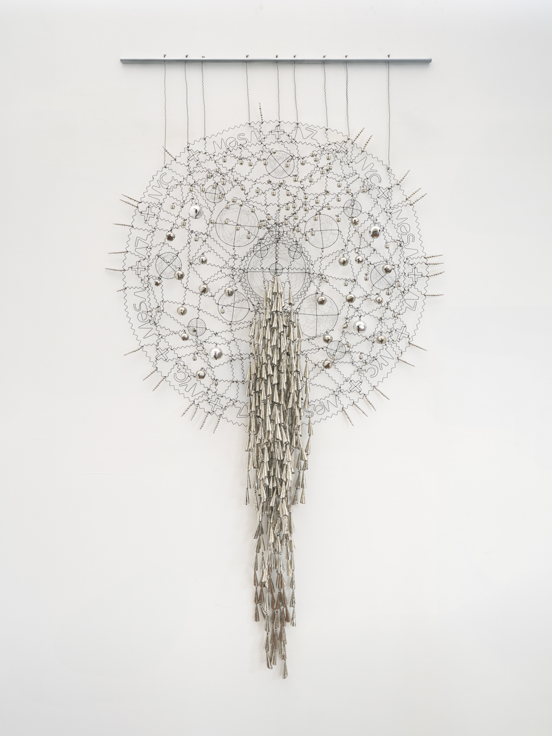Brad Kahlhamer, Mesa AZ + NYC Dreamcatcher, 2025, Mixed media, wire and bells, 93 × 53 ½ × 6 in, 236.2 × 135.9 × 15.2 cm