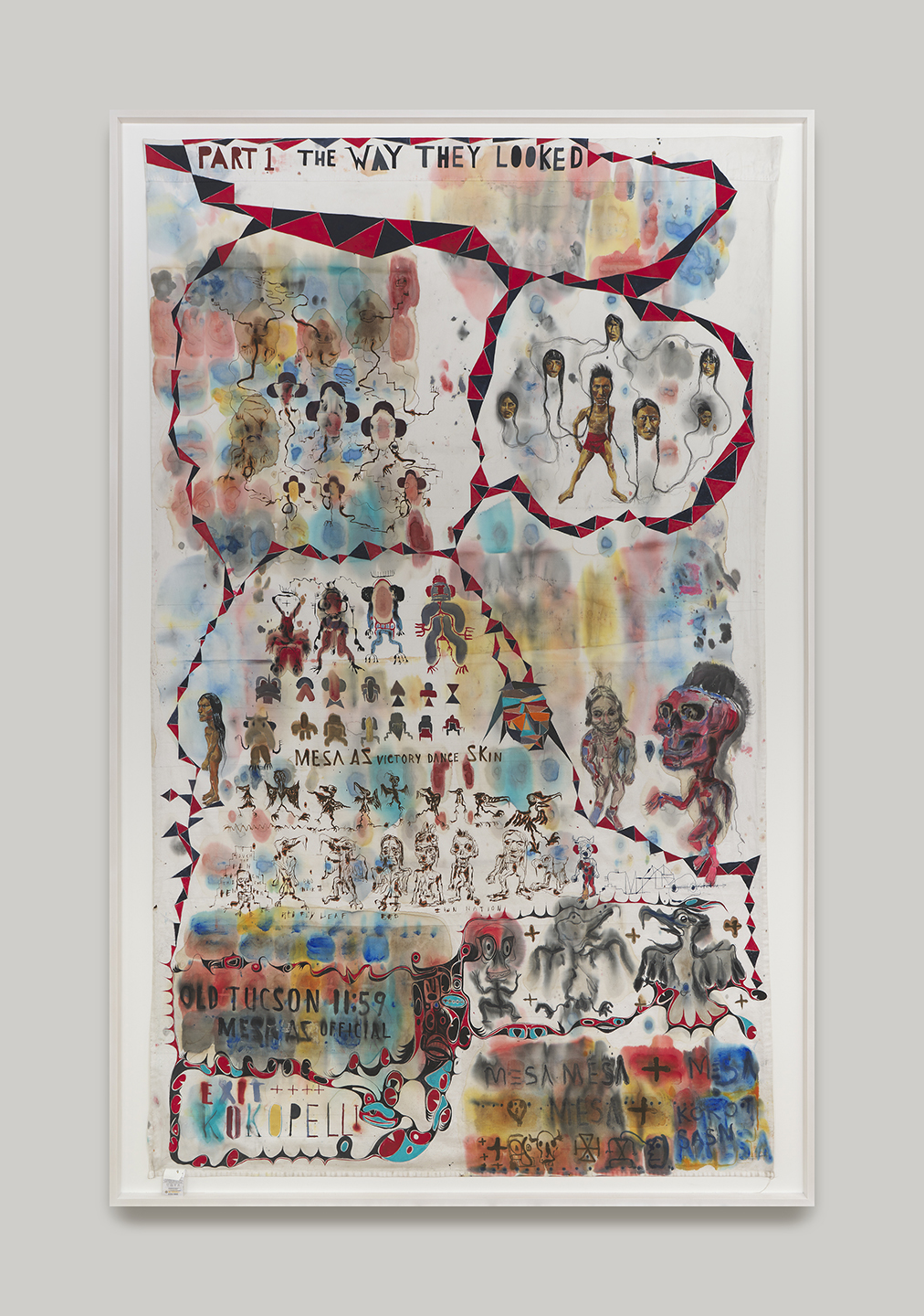 Brad Kahlhamer, Exit Kokopelli, 2025, Acrylic, ink, pencil on bedsheet, Work: 99 × 61 in (251.5 × 154.9 cm), Frame: 104 × 67 in (264.2 × 170.2 cm)