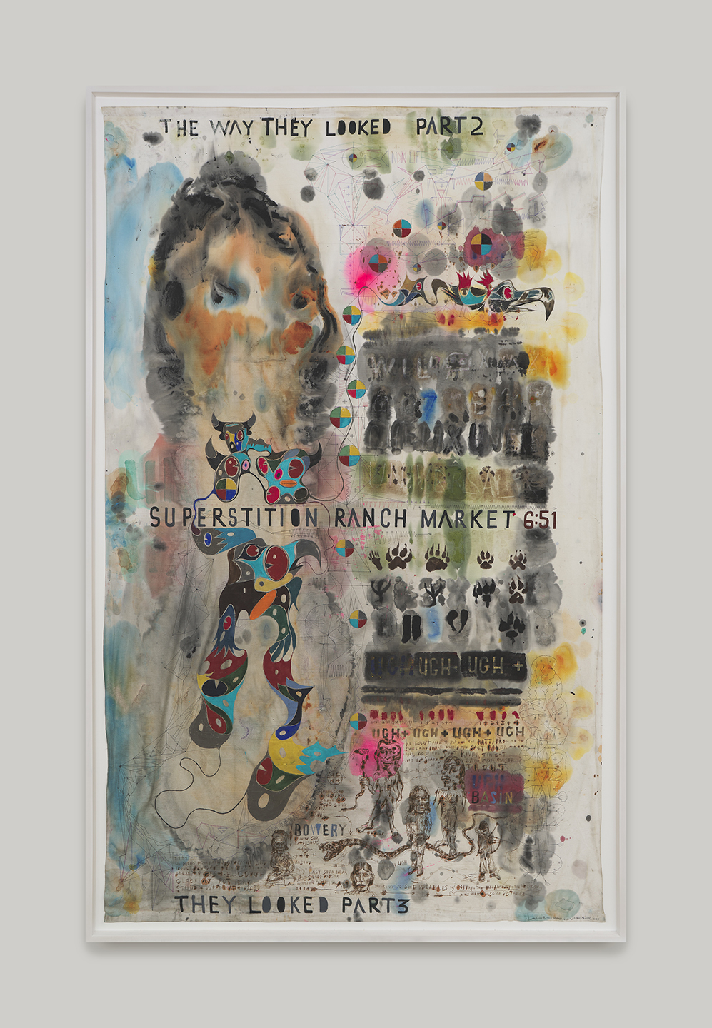 Brad Kahlhamer, Superstition Ranch Market 6:51, 2025, Acrylic, ink, pencil on bedsheet, Work: 96 × 59 in (243.8 × 149.9 cm), Frame: 99 ¾ × 62 ¾ in (253.4 × 159.4 cm)