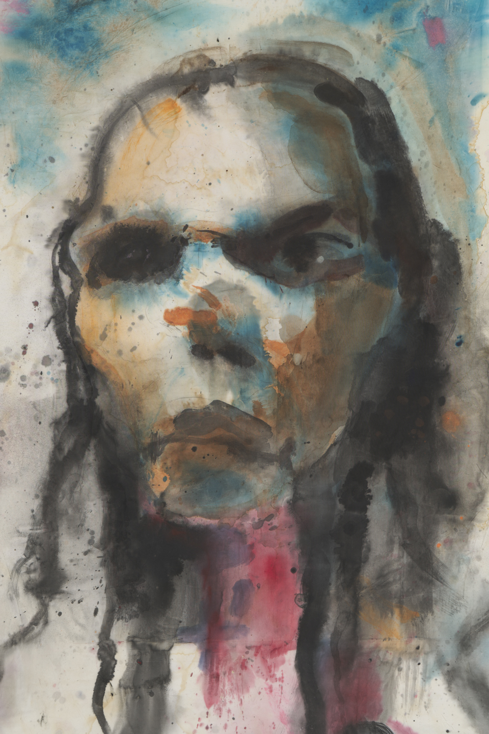 Brad Kahlhamer, Pima Air + Space, 2025, Acrylic, ink, pencil on bedsheet, Work: 64 × 49 ¼ in (162.6 × 125.1 cm), Frame: 69 ¼ × 53 ½ in (175.9 × 135.9 cm)