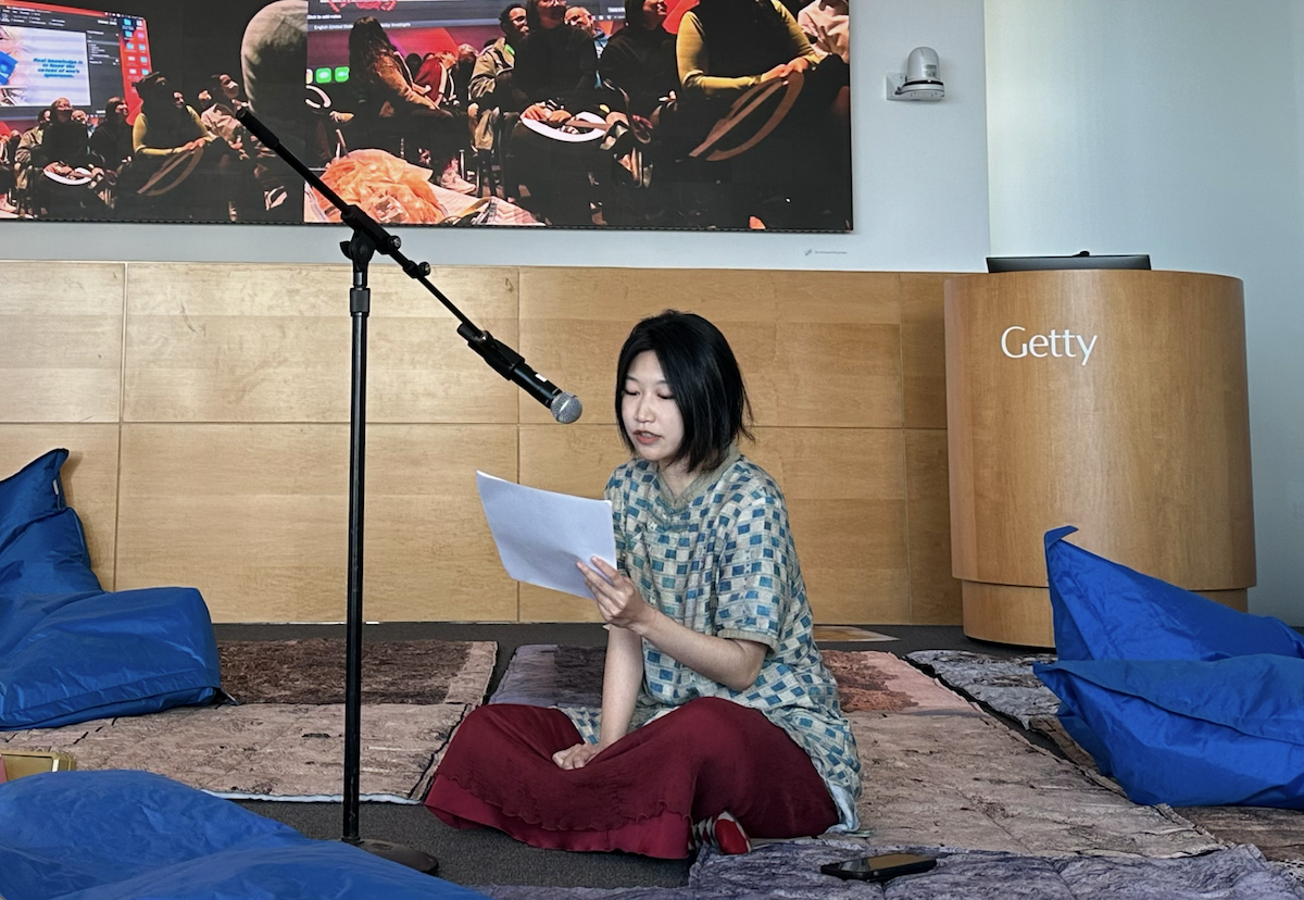 This understanding of care was further activated in 24 HOUR CARE, a performance project initiated by the artist collective FXR at the Getty Center. As part of the AAPIAN Open Mic, Zhu responded to the question, “What is care?”—a prompt that extends beyond her work into broader considerations of lived experience.