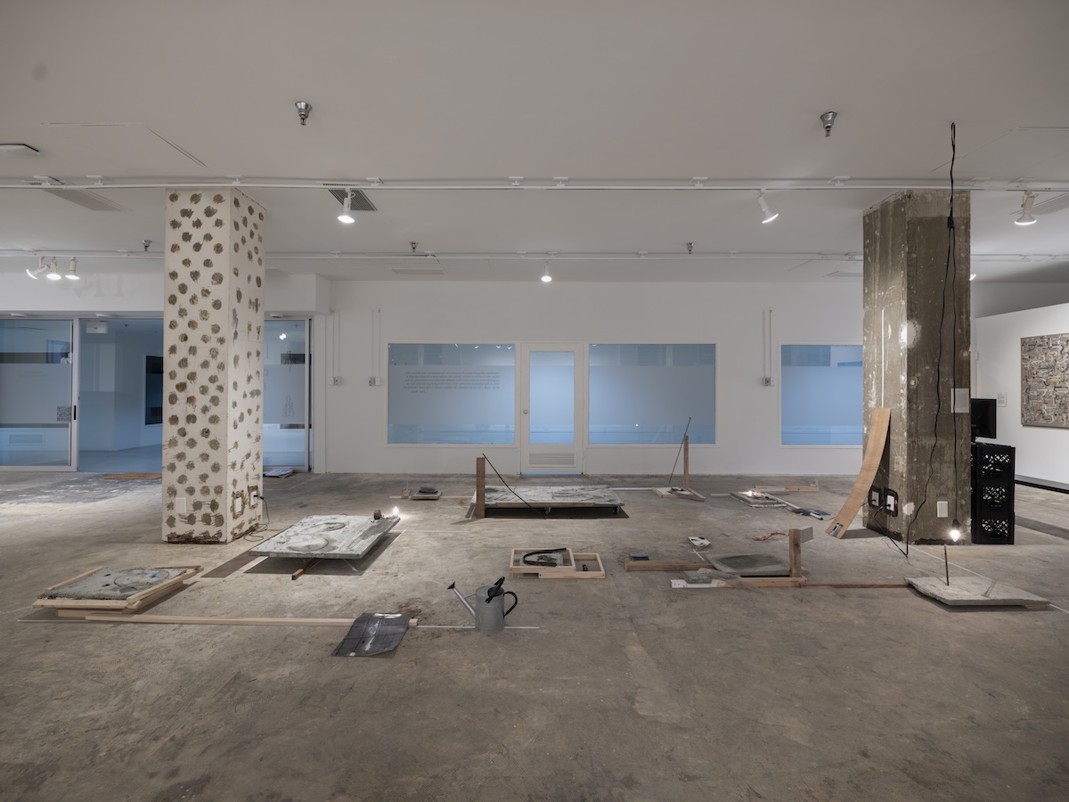 Delay of Termination (2026) extends Zhu’s earlier project Still a Long Dream (2025), also presented at The Reef. The installation draws from the architectural mapping of Dynasty Plaza in Los Angeles Chinatown, constructing a landscape suspended between endurance and erasure. Concrete slabs hold imprints of discarded commodities, preserving blurred afterimages of vanished lives. Structures, debris, and fragments converge into a fragile archaeology in which foundation and ruin, memory and forgetting, become indistinguishable.