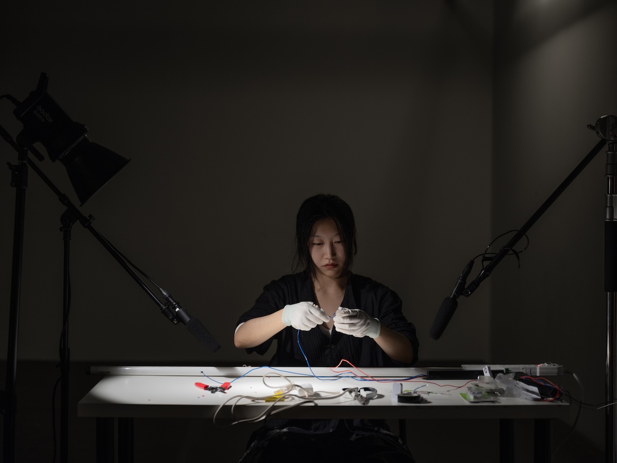 The performance unfolds without speech or music. Instead, sound emerges from the friction of wires, switches and glass that amplified through shotgun microphones. The faint hum of electricity, the sliding of glass tubes, and the repetitive clicking of switches accumulate into a fragile sonic field. These mechanical sounds resemble murmurs, almost like the breath of something barely alive, forming a perceptible language. Rather than illustrating the process, they translate its internal states: hesitation, repetition, exhaustion, and persistence. Through sound, duration becomes palpable without requiring visual resolution.