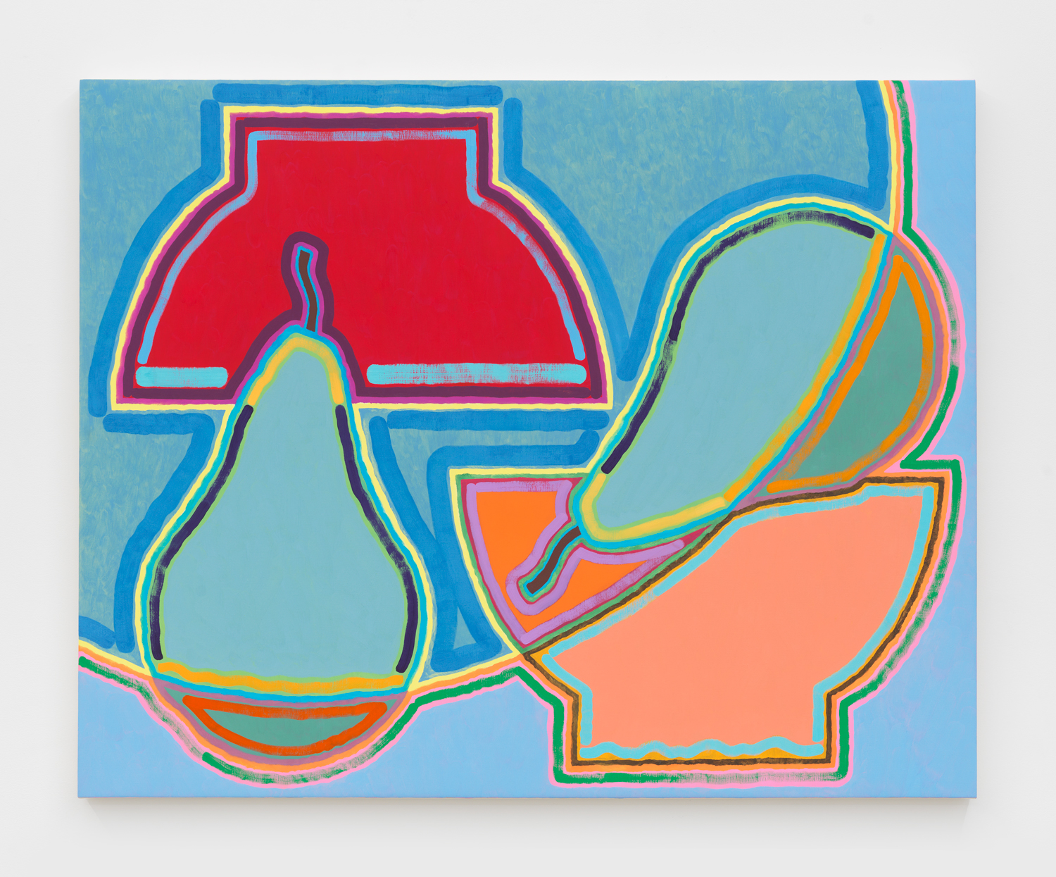 Her paintings often reveal their artifice. Color functions less as a simple depiction and more as a structural element. A pear might be blue against a mottled background; a jug could glow in cadmium red, defying any believable light source. Such chromatic boldness recalls Henri Matisse, for whom color was not subordinate to drawing but its equal. However, where Matisse sought decorative harmony, Coulis embraces dissonance. Her outlines press firmly against her shapes, flattening space even as shadows create a sense of depth. This results in a push-and-pull that echoes Cézanne’s constructive brushwork while acknowledging the legacy of modernist flatness articulated by Clement Greenberg. Greenberg’s famous dictum—that painting must recognize its own two-dimensionality finds a playful afterlife here. Coulis respects the flatness of the canvas even while experimenting with illusion, as seen in “Shaky Olive”, 2026. The painting’s composition includes two bowls and an olive. The darker hue surrounding the light blue bowl creates tension with the yellow-shaped bowl form, which sits neatly at the bottom edge of the canvas, acknowledging the painting’s physicality all the while straddling a pictorial space.