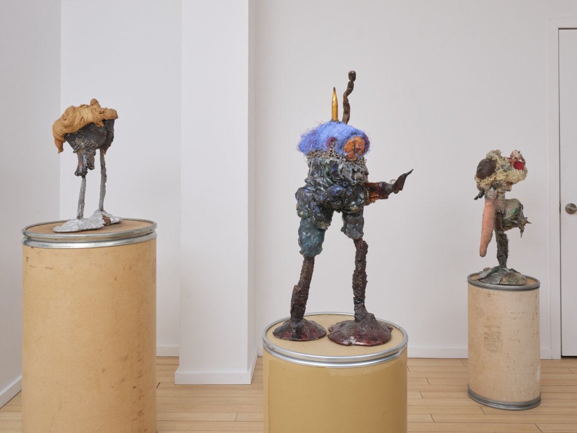 The work immediately provokes the question: what am I looking at? The viewer is naturally drawn closer into the three series presented—or “veins,” as the artist refers to them. The Pleasure Pipes are installed as a constellation of exotic material combinations, each pipe a universe of its own, exhaling anything from a Christmas ornament to corpses of spotted lantern flies. These works pay homage to the artist’s late grandfather, Frank, known to him only through photographs in which he was always smoking. Nearby, three medium-sized, figure-like sculptures from the Study for Brother series reference Giordano’s deep connection to his brother Anthony and their shared childhood memories. Opposite the pipes, two wall pieces from the My Matmos series—constructed primarily from boat cushions—are infused with tactile memory and craft-based interventions such as felting and tufting.
