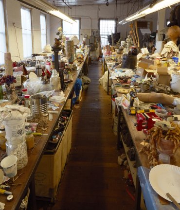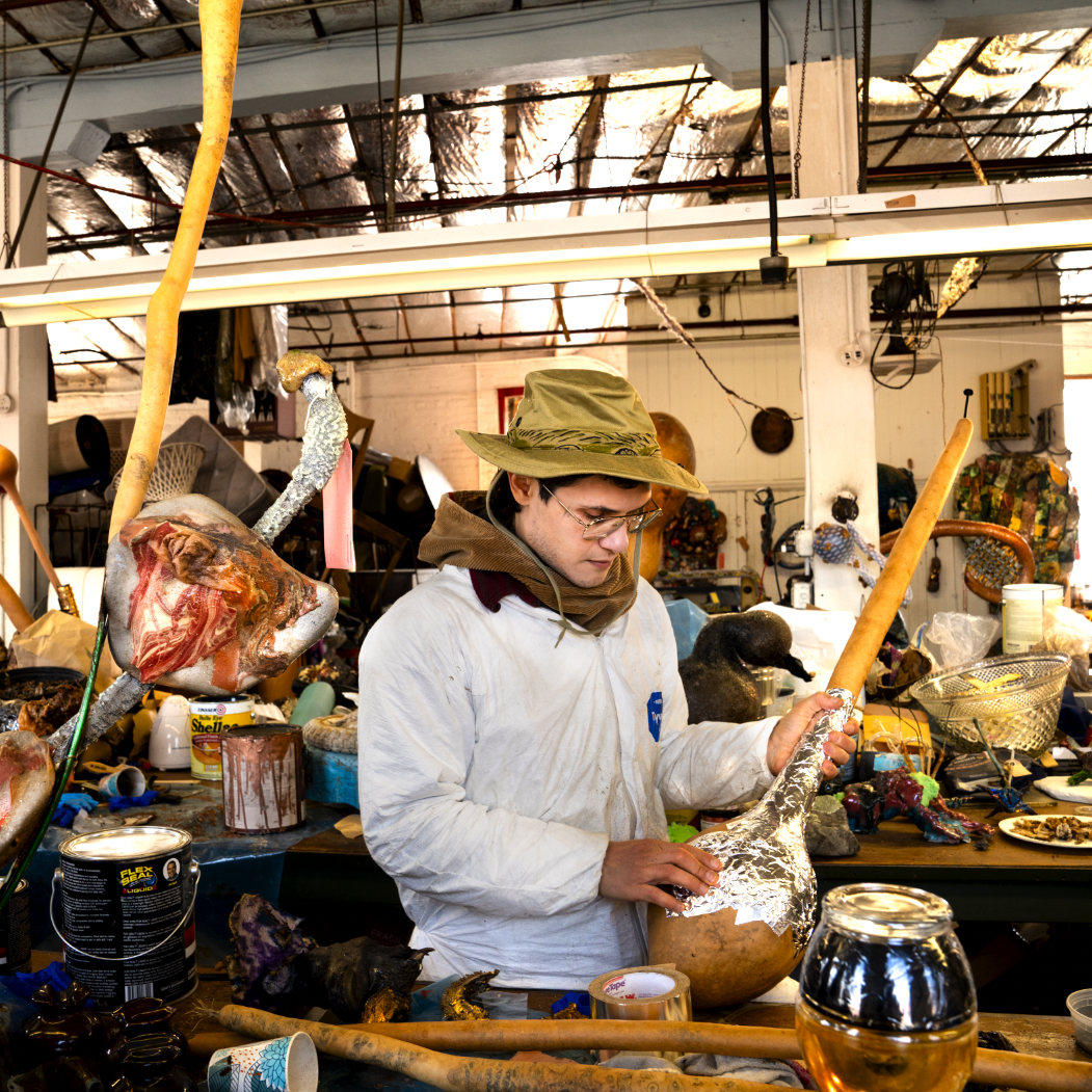 The production takes place at Vicki Island, Giordano’s studio in Newburgh, New York, located in what was once his grandfather’s coat factory, Vicki Clothing Company, named after his beloved aunt. The space reads like a surreal, post-apocalyptic Oz: part archive, part laboratory, part shrine. It houses a dense accumulation of materials and references—family history, Italian-American memory, and locally sourced objects from both the natural and post-industrial landscape—forming the raw substrate of the work.