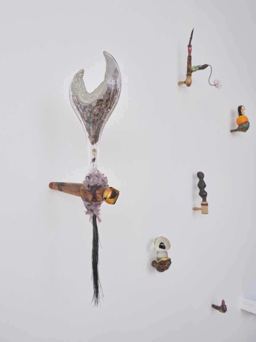 The assemblages draw from an unlikely convergence of materials: carved wood, raku-fired ceramic, cast aluminum, and substances such as lipstick, hair, hosiery, marzipan, and urinal cakes. These materials carry traces of intimacy, sweetness, and decay—registers of the body and its maintenance. Encased in resin, they are preserved in a state that feels both fetishistic and forensic, as though the artist were archiving sensations rather than objects.The material list for each piece is a delightful read, in which the process is exposed as a confrontation with what we would rather not see.