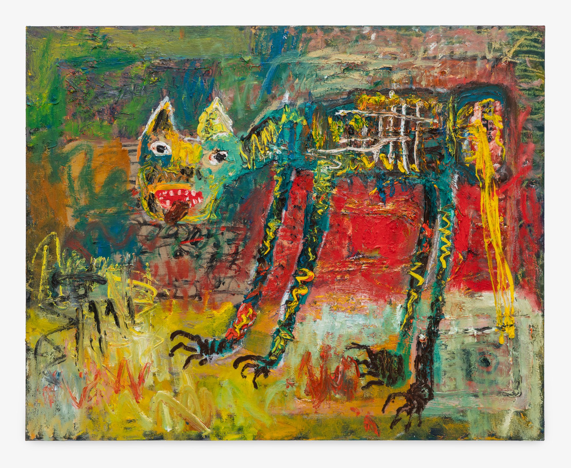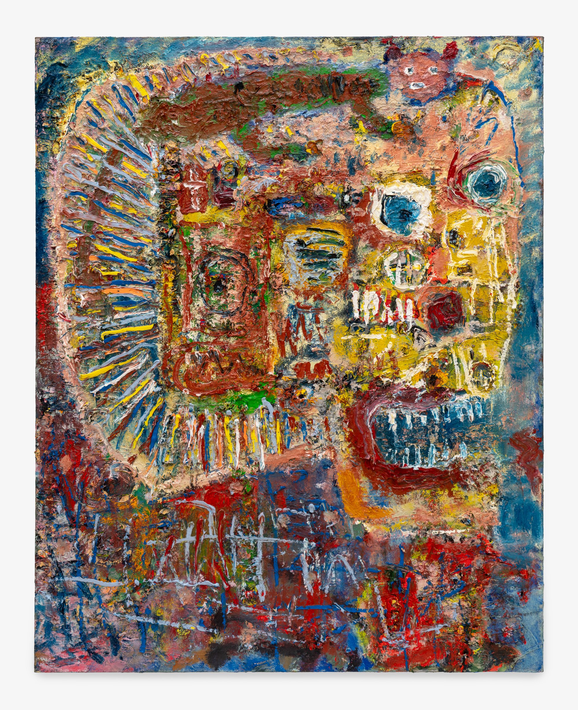 Walking on the Sun, 2026, involves a devouring skull profile, seeming lifted from the repertoire of both Dubuffet and Jean-Michel Basquiat with more grizzle and compulsive handling.