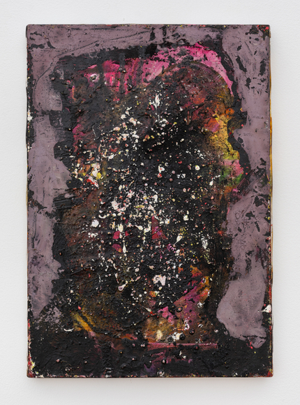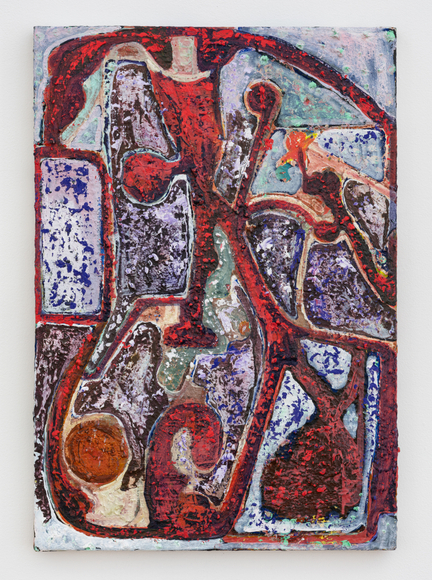 Things change-up in the easel-sized pictures. DiBenedetto toys with structure, gesture and surface to great effect as in Stalker, 2026, that can be read variably as a burnt-out microchip circuit, or a rune carved into beautifully patinated stone.