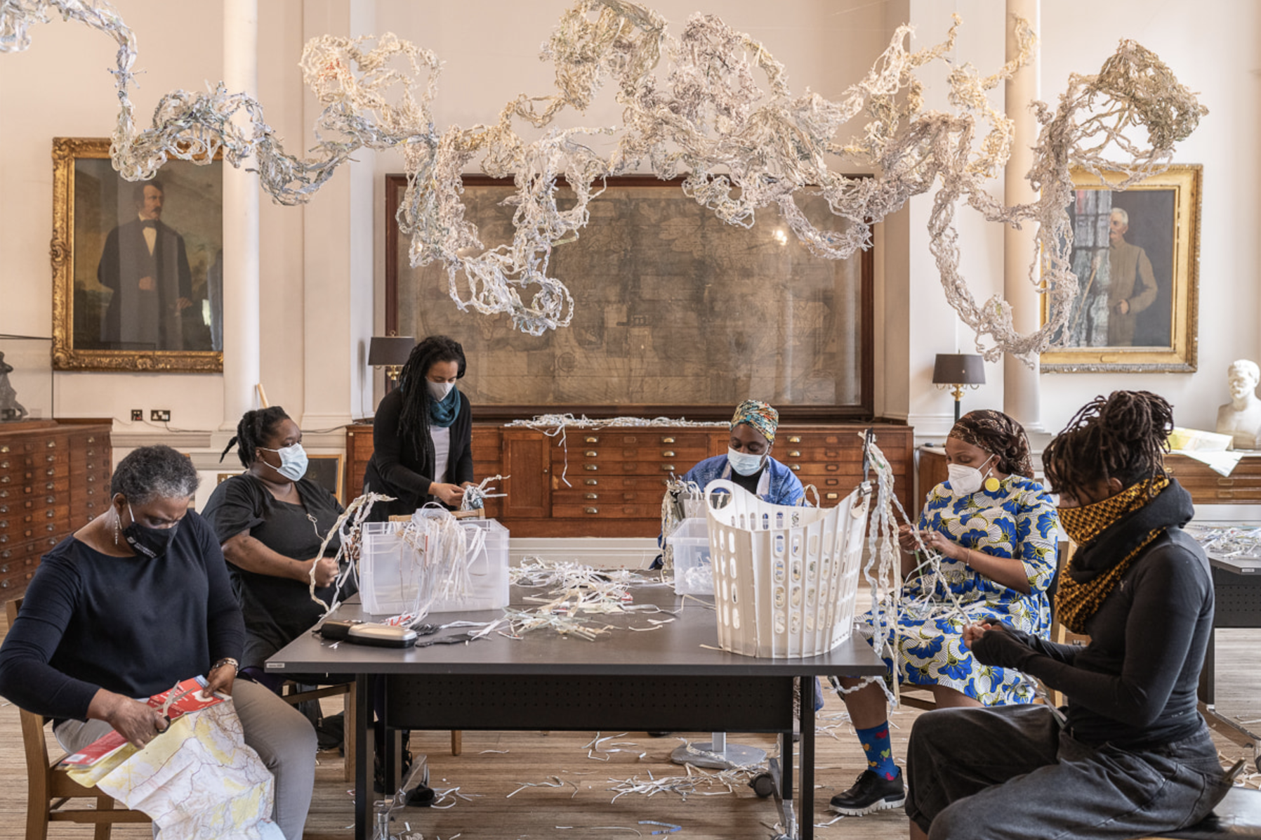 This collectivity was a much appreciated reprise for Barrett, after having worked with retiring furniture for so long. “We worked together, six women, for three days. We shredded, we braided, we ate together, we had music. And this was happening in the Royal Geographical Society, a huge, stuffy manor house in Central London. It felt radical. Offensive even. Shredding these maps in that space.” The sculpture became a way of holding that collective experience. It moved beyond knowledge-making and into care.