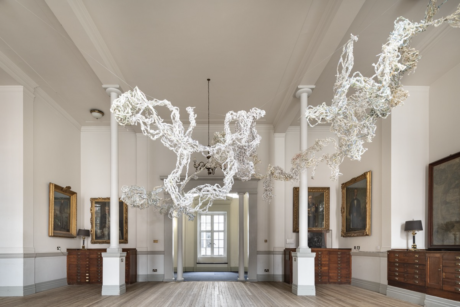 Eventually, Barrett expanded upon the ideas found in her furniture series through lighter and more collective means. In 2020, Barrett staged a powerful intervention by shredding and braiding maps into a monumental hanging sculpture at the Royal Geographical Society. These were not just historical charts but also contemporary maps, transformed into flowing strands of paper and printed topography that looped through space. She worked on the project with a group of women during lockdown, finding a rhythm in the collaborative act of cutting and braiding.