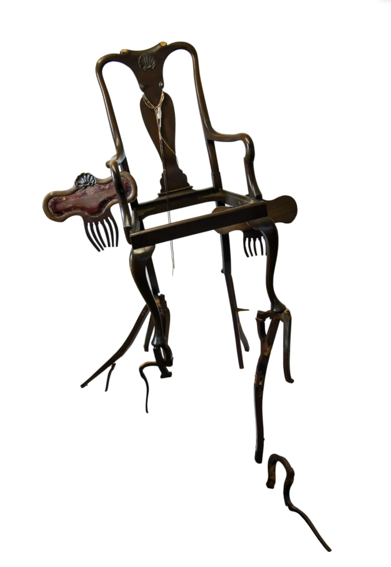 “I started with furniture because it was what I had,” Barrett says. “But when I looked closer, I realized these chairs and tables were already telling stories.” Barrett’s foundational sculptures began after noticing and doing research on 18th Century Queen Anne–style furniture, ornate pieces often seen with clawed feet or animal motifs.