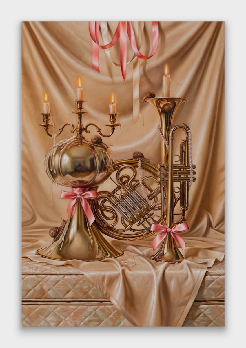 The brass instruments, and even the wooden ones, are sort of masculine figures for me, or parts of my own life. When they’re inflated, that’s me trying to figure out how to show up in this moment, after Obama, after Trump, after MeToo, George Floyd, all these points of cultural shift. There’s not really a script. It’s just trying to figure out how to show up for people. But stepping back, each of these works is still a vignette. Follicular and Last of Kin are really about thinking through having a child, going from where I am now, fairly free, to being responsible for someone else. And the snail is a recurring motif, it represents a memento mori.