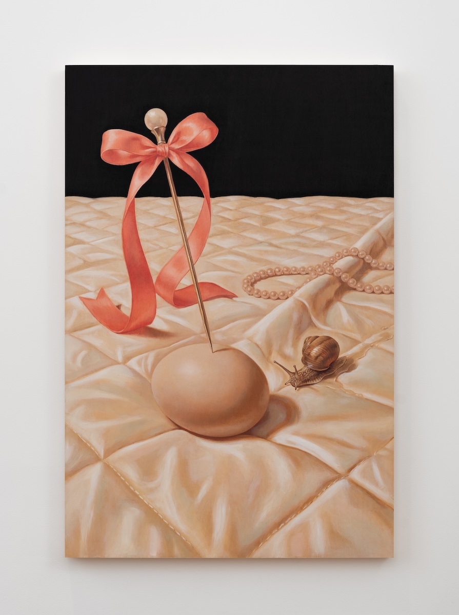 The way that I work, I do a lot of works on paper, a lot of sketches. When I’m in the studio, I’m doing a lot of writing, reading, but mostly writing about what I’m feeling and ideas for compositions. Over the past two years I probably drew, like, hundreds of slugs and snails and so forth. So I develop the iconography based on what I’m feeling, and the story I want to tell, kind of weaving together these vignettes. Each painting is a vignette from my own life. So for example, just starting here, this one is Last of Kin. And then this one over here is Follicular. Both of these I conceived when my partner was freezing her eggs. So that egg is quite literal. That experience forced me to think, do I want to have kids? Do I want to have kids with her? I mean, I always wanted to, but then you start asking yourself, what’s stopping me, why now, why not? So I was kind of diving into that internally. And in these works, the pearls, the ribbon, the lipstick, they all allude to a feminine presence in the images.