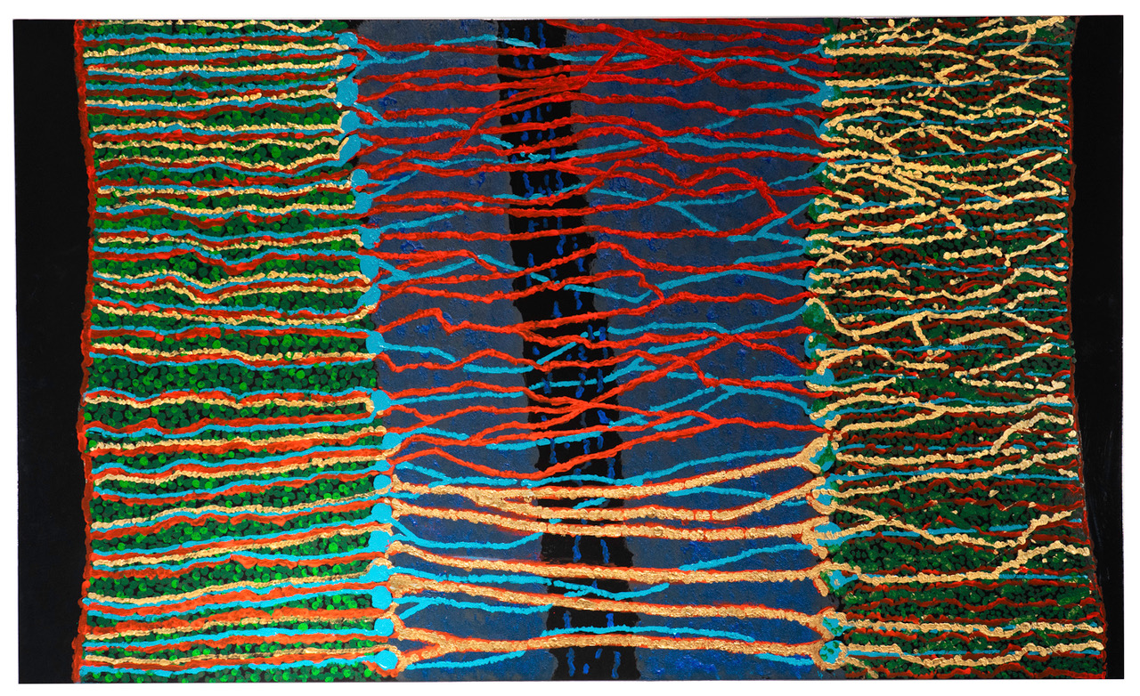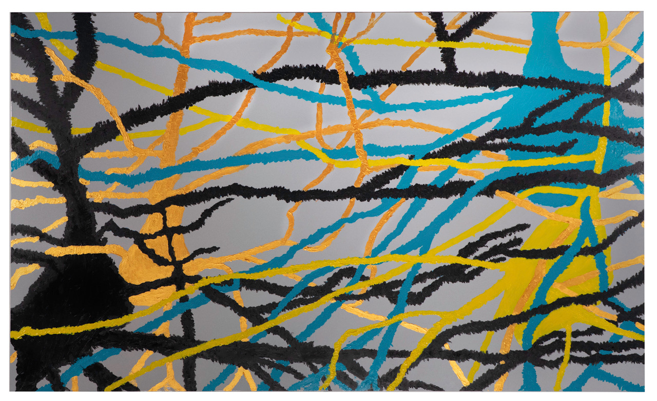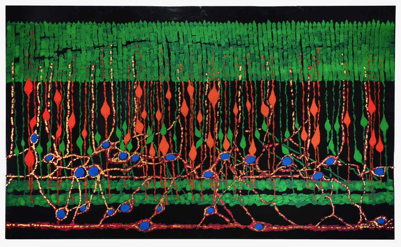 In the hanging, Unseen Layers presents many of these images that juxtapose in unanticipated ways, so that they reflect upon one another. Even the more familiar images, such as of neurons, can take on new meaning when presented alongside something surprising, like the brain of a mouse. At the same time, these paintings are pleasing and charming and delight the intellect and the eye. Unseen Layers reminds me that the fullness of my bodily history is within me.