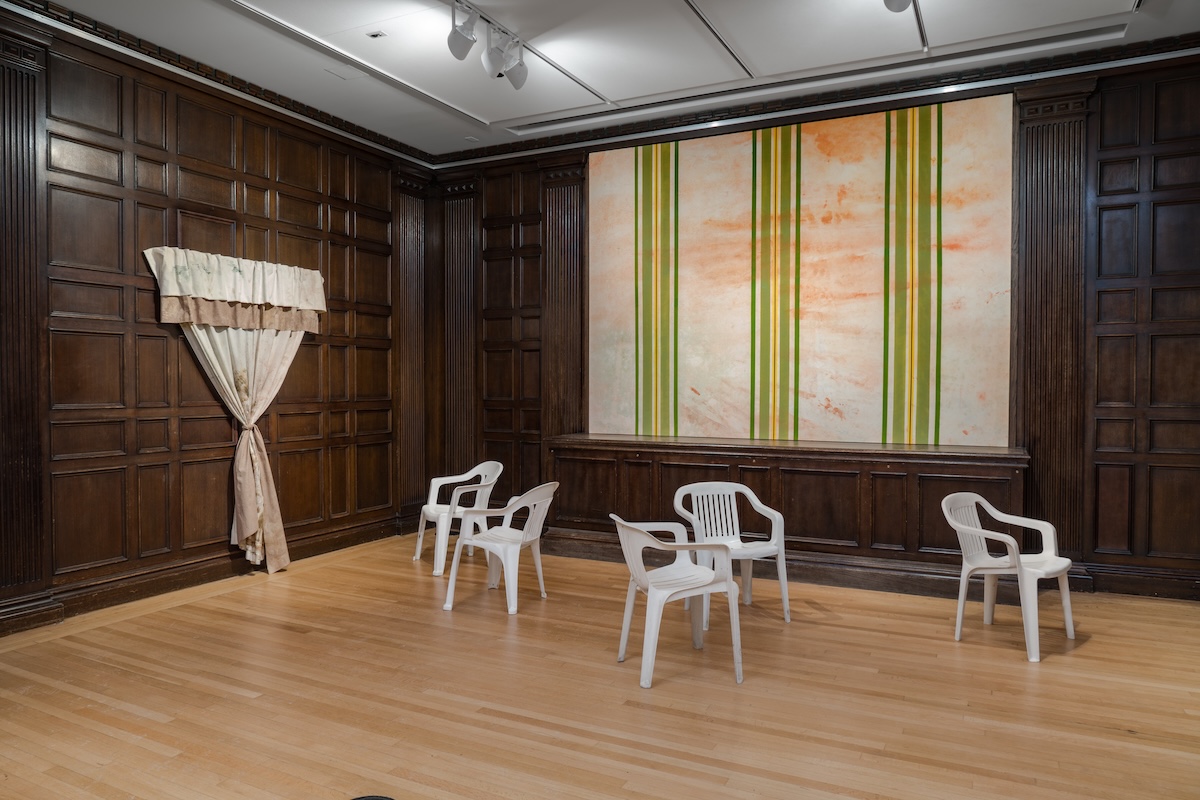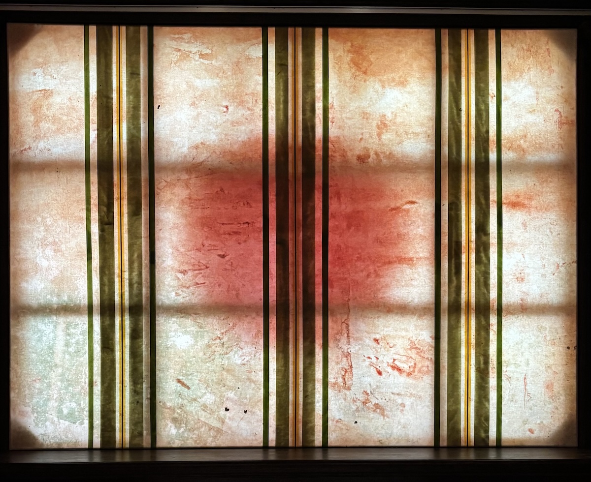 Værslev’s paintings investigate the ways that paint can appear, both on the canvas and in the exhibition space. When walking through the Neubauer space, it is easy to miss Untitled (Japan) (2025), or, more accurately, it is almost impossible not to miss it. That is because it is placed behind another painting, Untitled (2025), which is situated in front of a window and depicts green and yellow vertical stripes with washes of pink. However, when the lights are turned off—an act that feels illicit in the already dark exhibition space—a red circle glows from the window, faintly illuminated from the light outside. The red circle could be blood seeping through fabric from a wound, or an evening sun. However, this is a rare work where Værslev’s title provides guidance, and frames this startling moment around a national signifier.