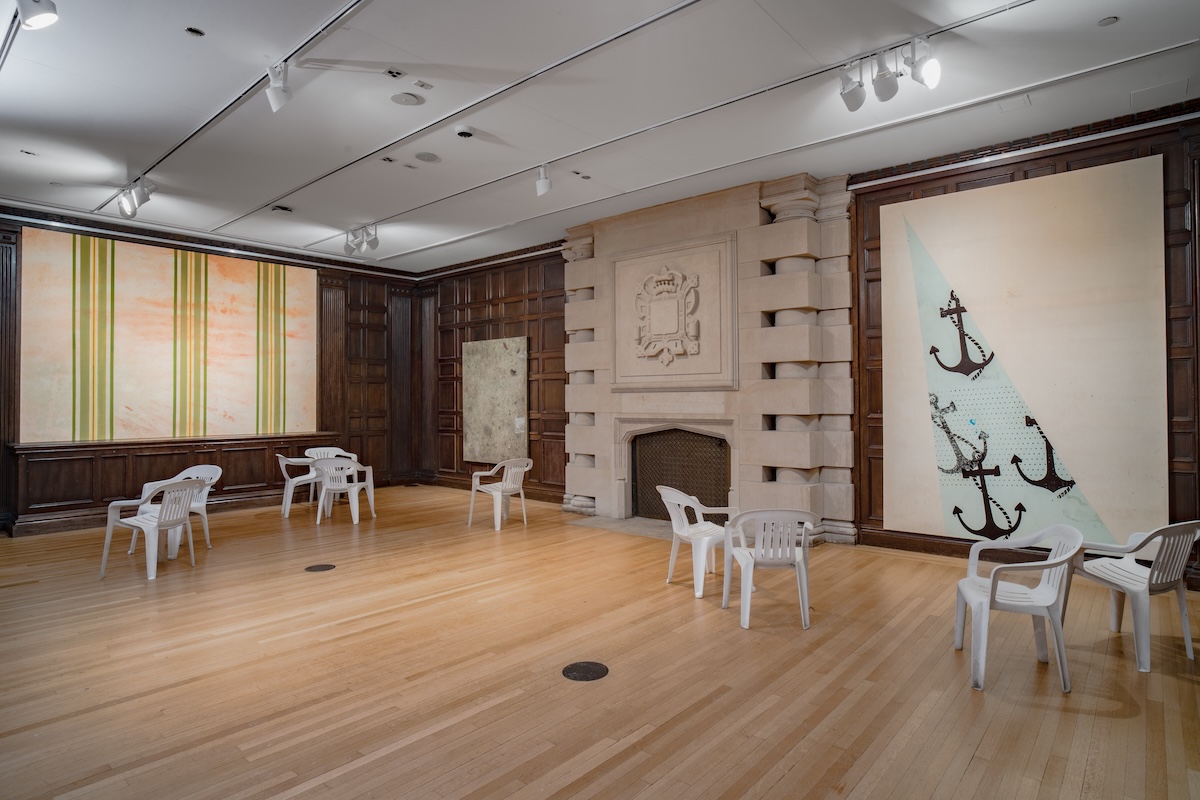 The exhibition title “The Joy of Painting” may sound familiar to many, likely because it was the title of Bob Ross’ long-running PBS series. The program provided step-by-step instructions on how to paint idyllic landscapes. Ross was soothing and unpretentious in his instruction, teaching viewers that each individual brushstroke could contribute to a cohesive whole. In Fredrik Værslev’s exhibition, curated by Dieter Roelstraete at the Neubauer Collegium, he performs the reverse. Each canvas invites the viewer to read against illusion and to investigate how abstract painting is formed. Signs and symbols peek out from brushstrokes, canvases vary in size or dissolve into curtains. While the viewer may try in vain to identify a definition of abstraction, the paintings stubbornly resist. The act of looking at the paintings through a taxonomic lens gives way to the act of simply looking at the paintings, which is, indeed, a joy.