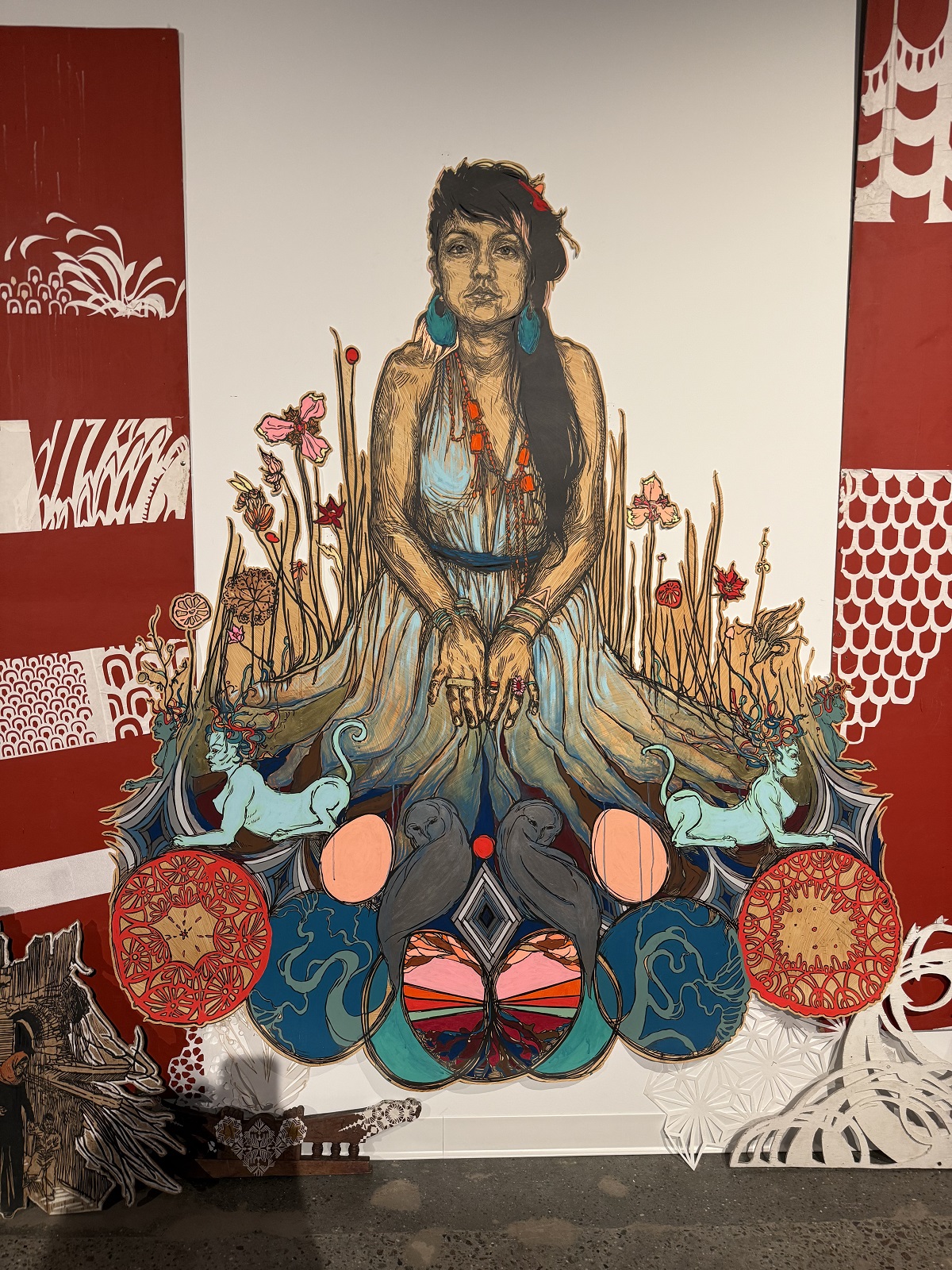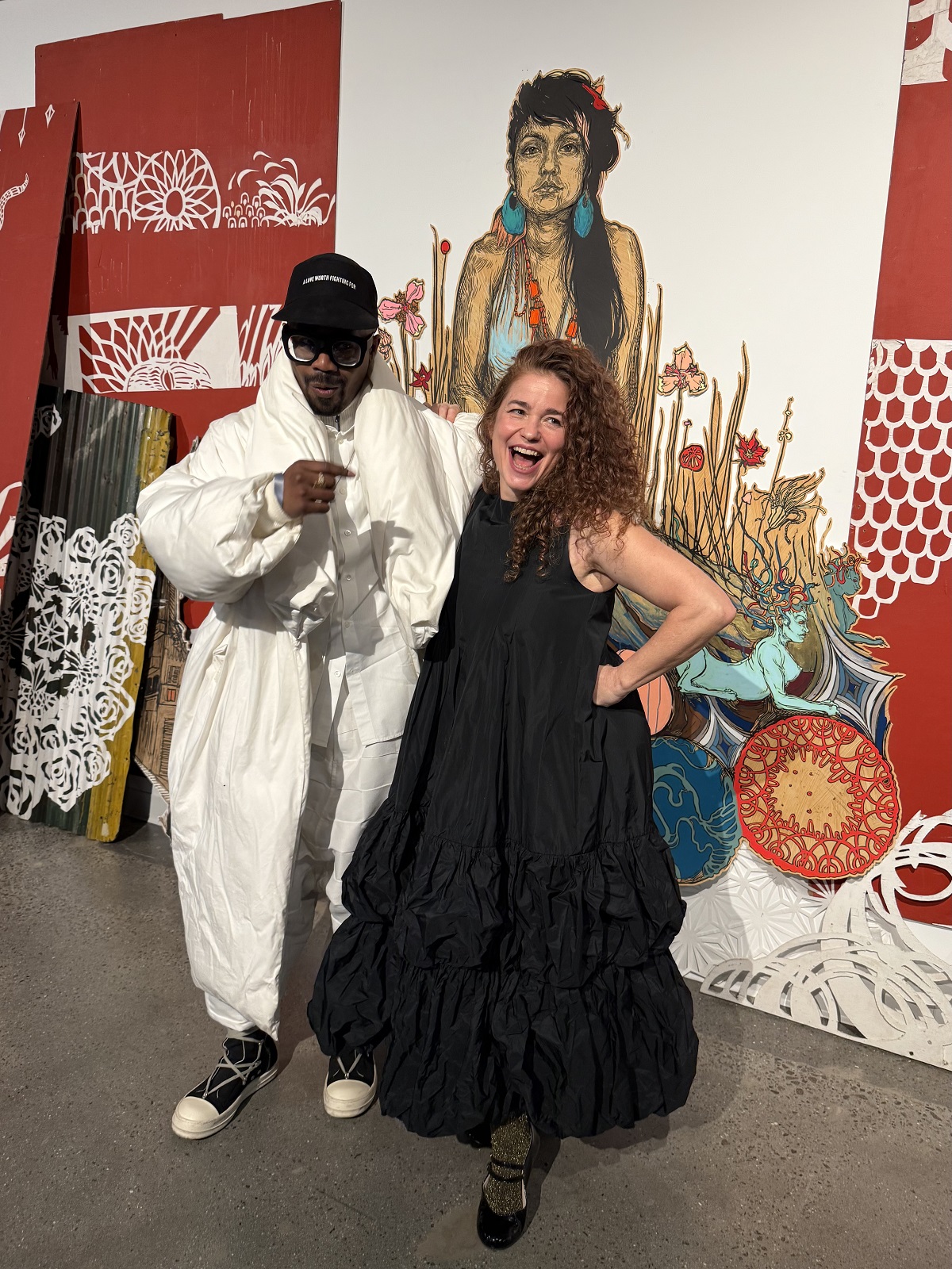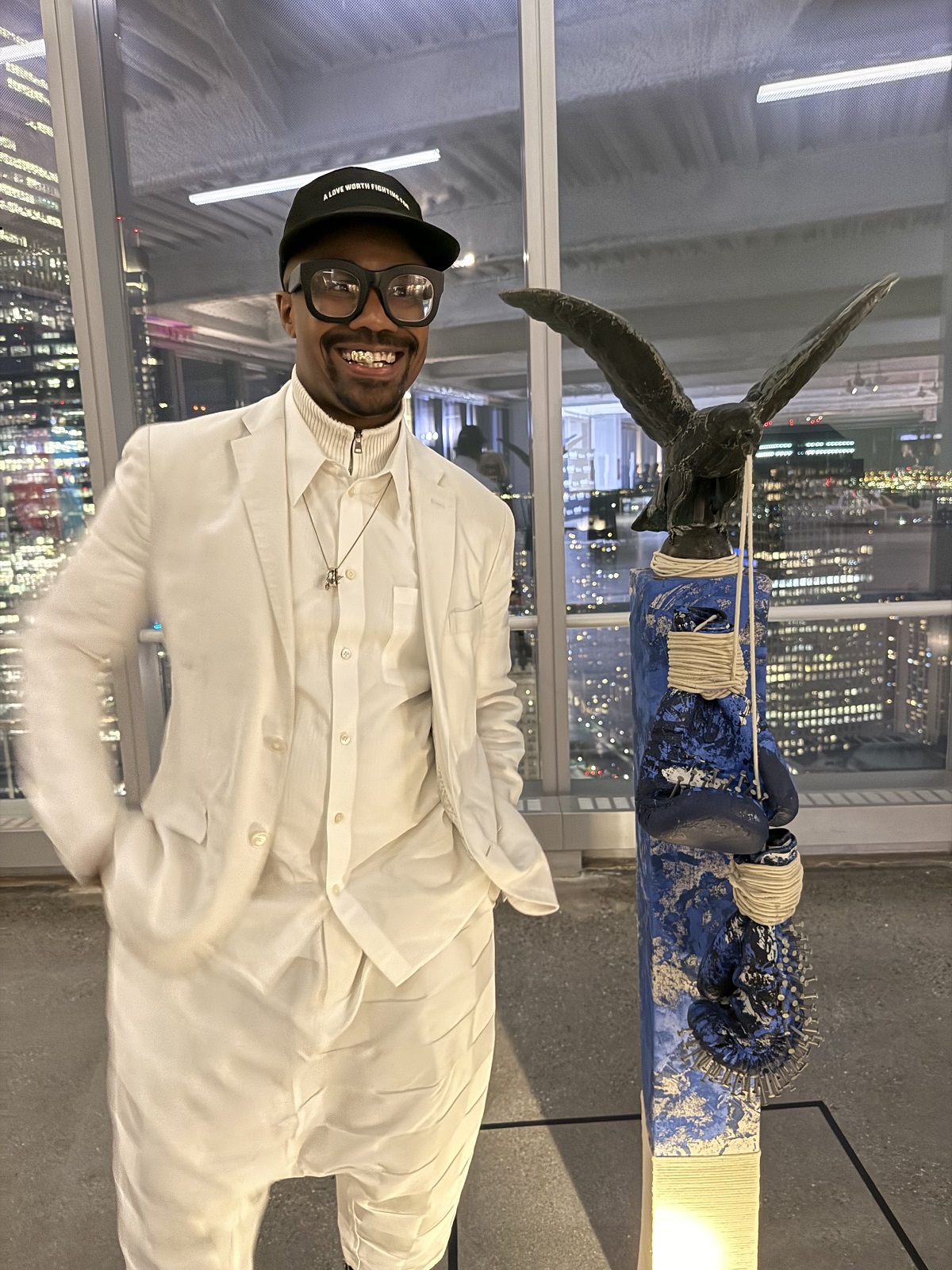 During dinner, I met Aristotle Forrester, a charismatic artist who makes his own oil paints. He switched into art after being a scientist at Harvard because he felt that his notable lab research would not land him a top position due to his skin color. Aristotle has Scottish, Trinidadian, and other ancestries. His painting “Through Their Spirits I Remember Shango,” 2023, is composed from hand-ground pigment, ash, and gold, and is a meditation on memory and transformation within the African diaspora. I was inspired to hear how well his art sells as a patron pulled him away to introduce him to friends.