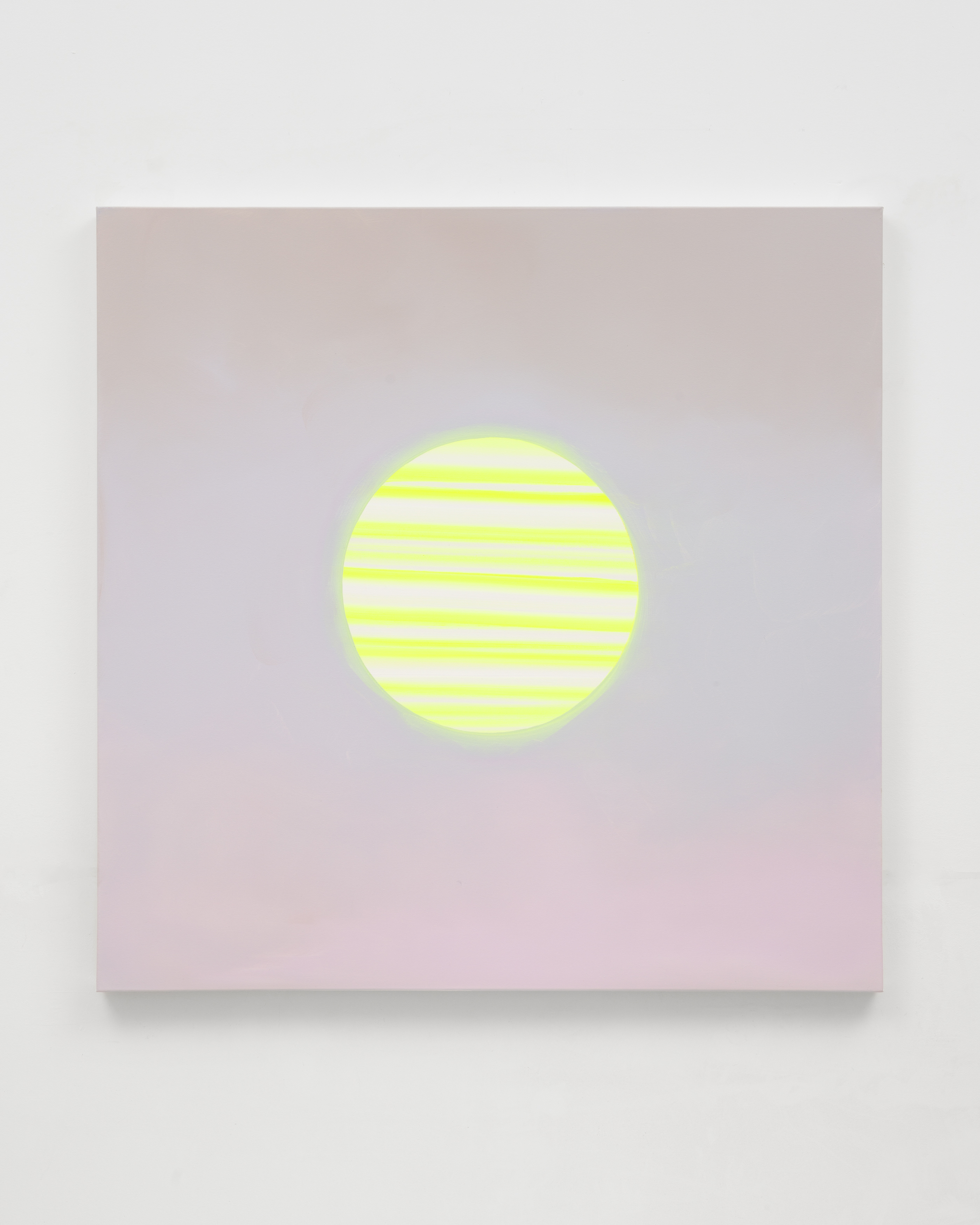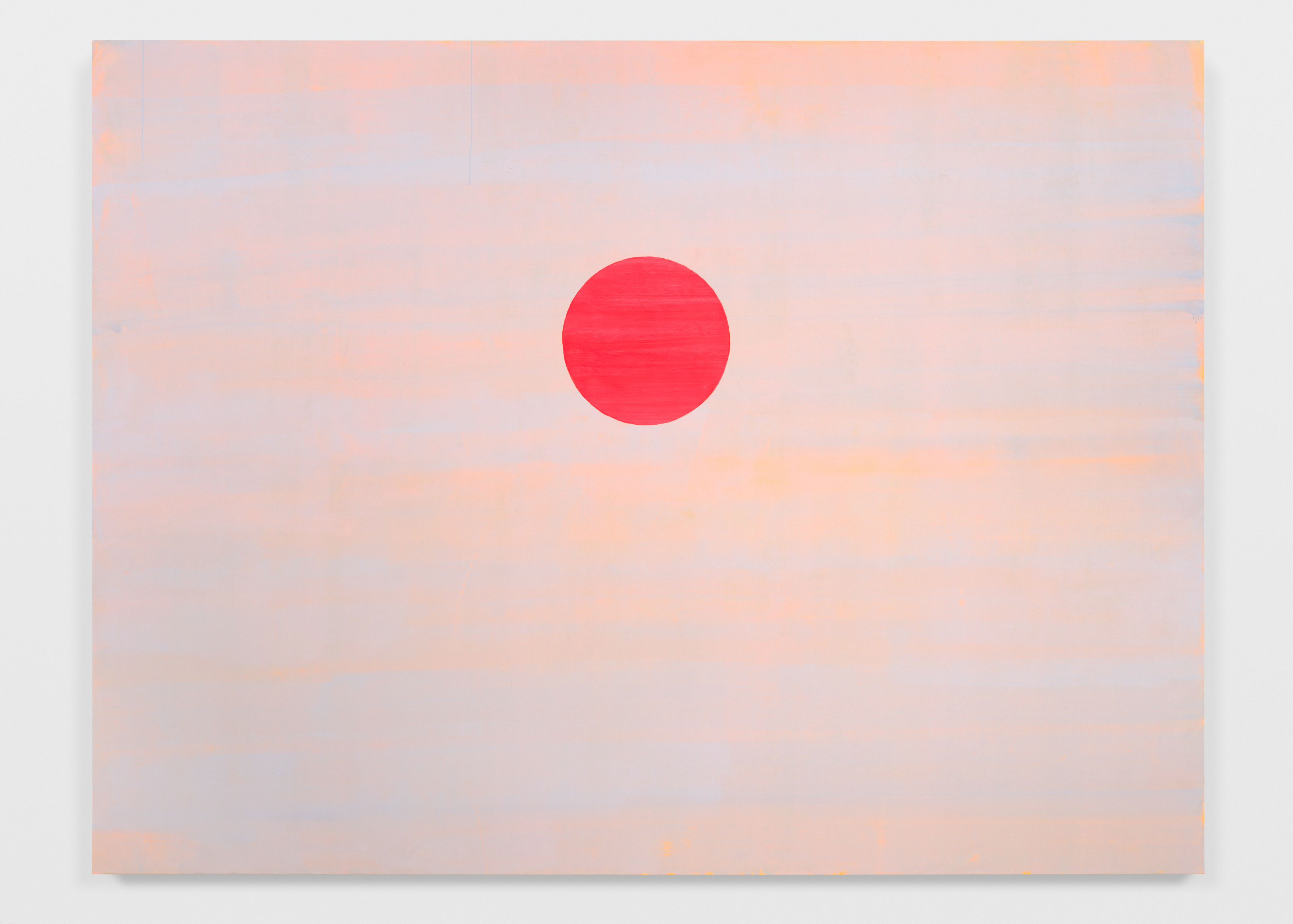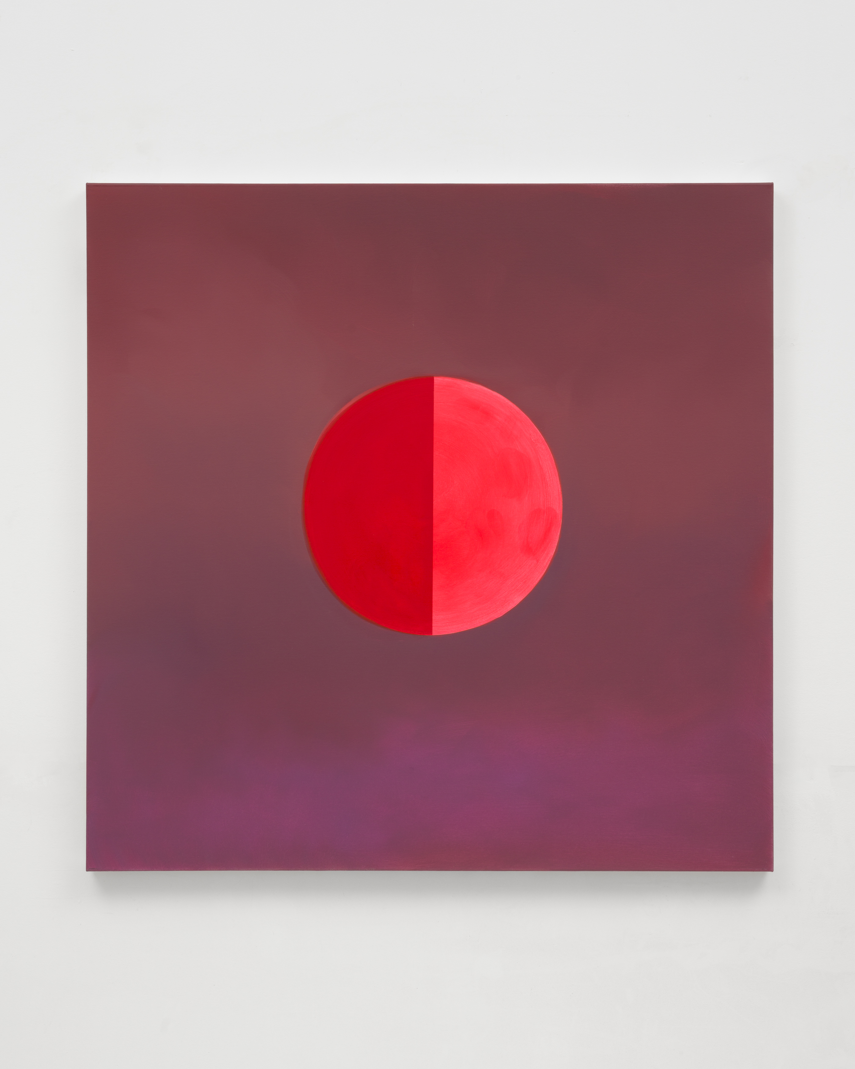 Magnetic Field consists of several large-scale paintings, ranging from 119 by 159 inches to more intimate works at 40 by 30 inches. All the paintings move freely between abstraction and representation, bound by an elusive sense of space and light. Many share a deceptively simple structure—a circle within a square canvas—as seen in the eight-piece installation titled Moon Walk. Yet the apparent simplicity of format belies the complexity of their execution. Spend time with these works and their sophistication becomes evident: like all paintings worth lingering over, they demand extended viewing to reveal their intricacies. On first encounter, Magnetic Field might seem almost too direct: a modernist gesture repeated across multiple scales. But beneath that surface, familiarity is a sly criticality. The circle-in-square motif evokes the rigor of Kazimir Malevich’s Suprematism and Josef Albers’s chromatic investigations, yet Koop’s canvases are less about pure geometry than about perception and emotion. The works oscillate between celestial suggestion and earthly reference, between formal reduction and sensory richness.