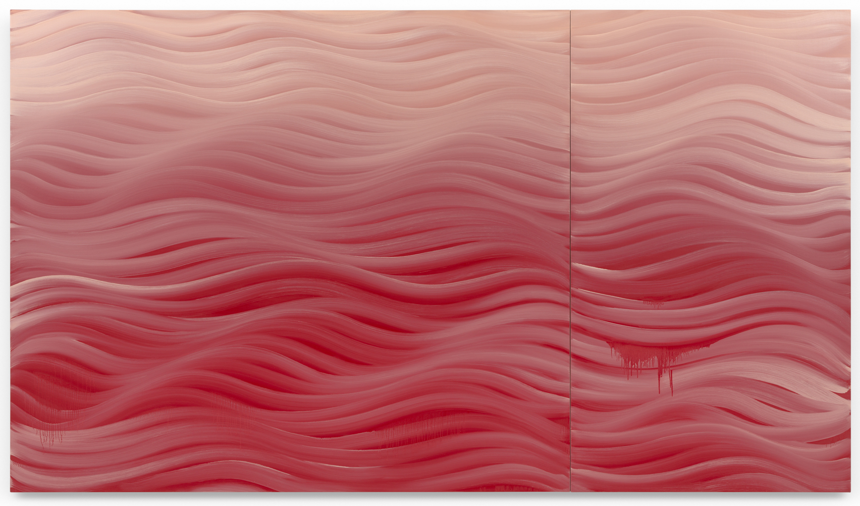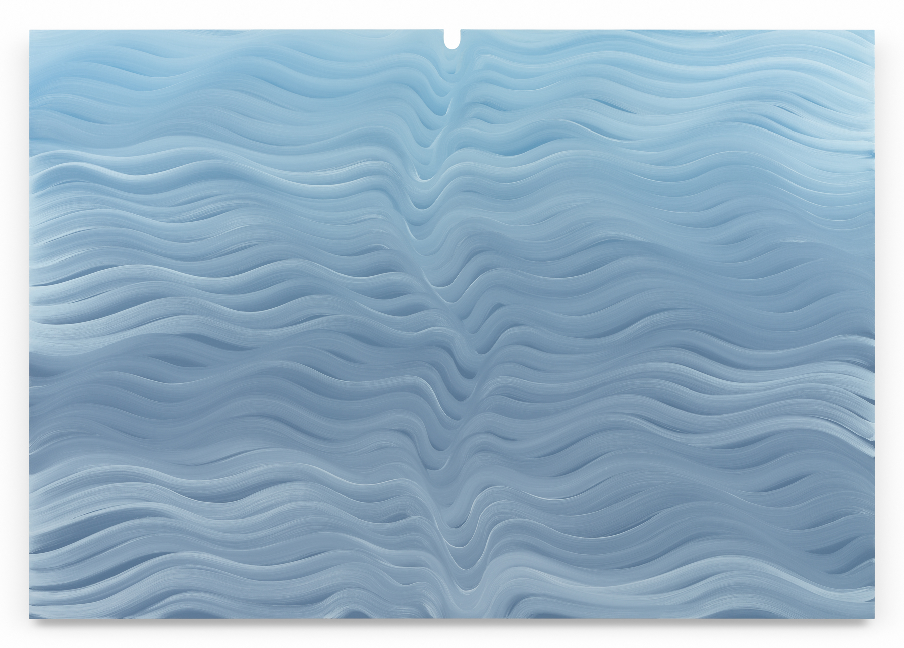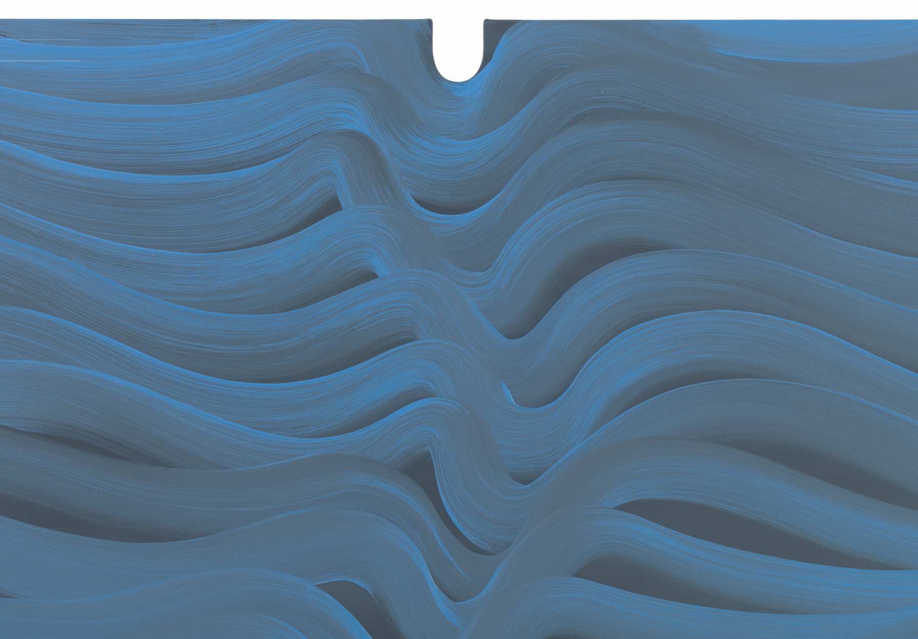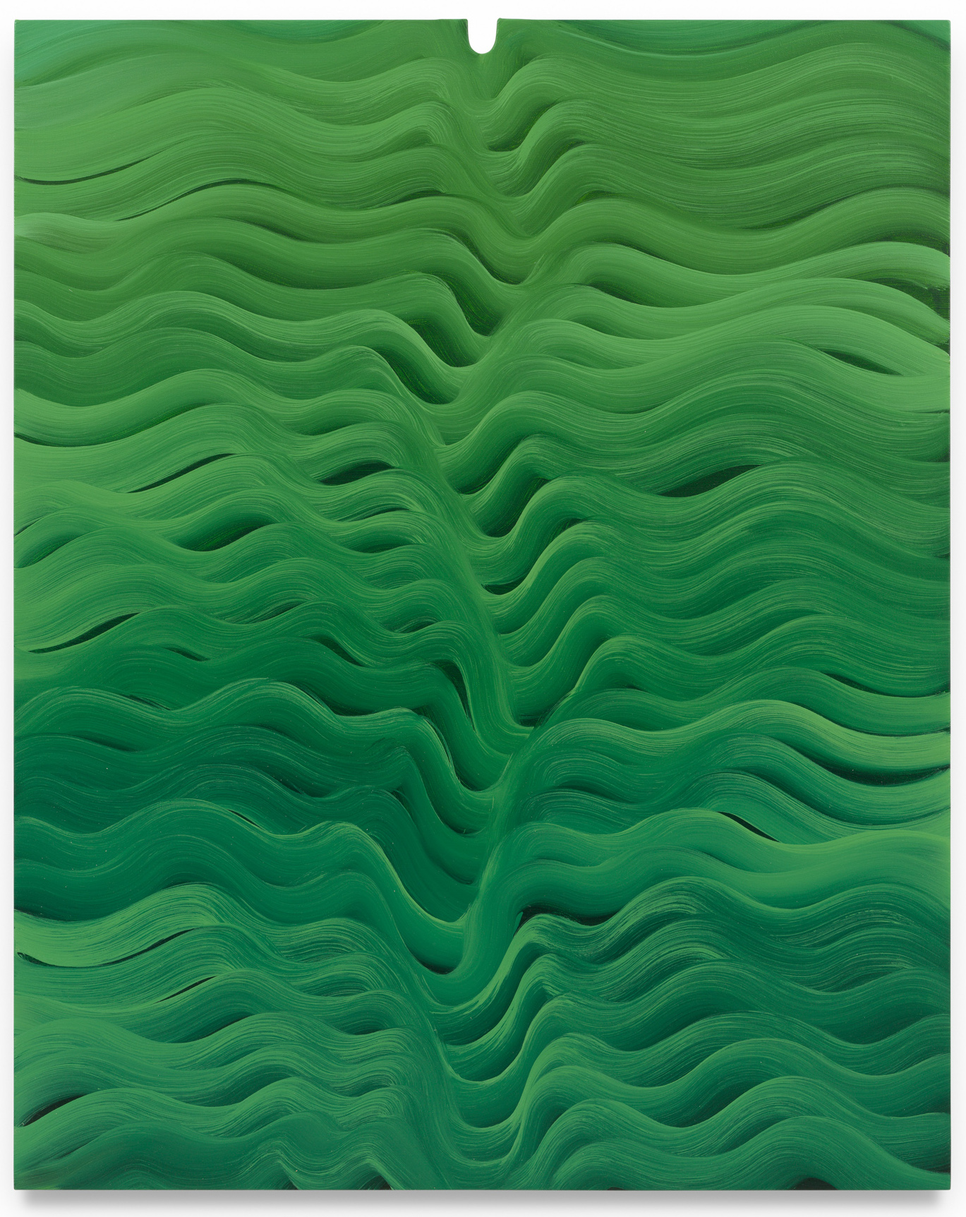 Davie has used the curved notch before, typically placing it at the bottom of the canvas. Reversing its position transforms the psychological weight of the gesture. At the top, the cut out becomes a kind of pressure point—gravity, tension, even a sense of containment bearing down on the gesture waves of paint below. The resulting compositions glide horizontally, their successive bands of color bending and undulating across the picture plane. The rhythm is almost musical, the marks slithering and looping in a measured tempo. Yet within that repetition lies the subtle awareness of collapse—each curve dipping down, hesitating, before straightening and continuing on its way.