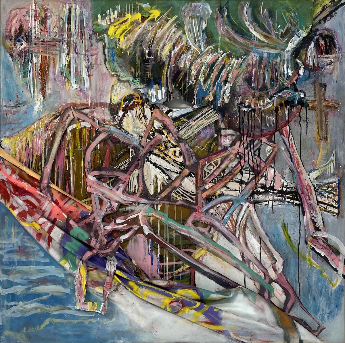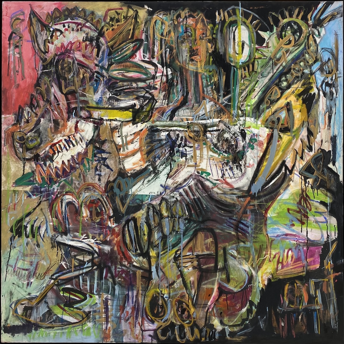 Dog Eat Dog, 2022, Oil on Canvas, Spray Paint, Oil Stick, Charcoal, Mixed Media, 60 x 60 inches