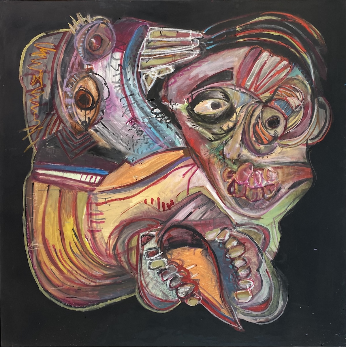 On a monitor to our left flicker scenes from Hakimian’s studio interview; before us and to the right hang three large-scale works that feature a range of techniques and approaches. Beginning with Fish of God (2022), we are confronted by a tapestry of collaged canvas fragments, one of which confidently sags off the frame’s bottom left quadrant. The titular figure, suspended above a cut-out scaffolding of jagged calligraphy, anoints its domain of flapping canvas waves with bile issuing in black rivulets from its toothed lips. To the right hangs WWIV (2022), a pluriform self portrait whose chaotic legions verge on abstraction against a backdrop of alternating patches of reds, pinks, blacks, and yellows. Hakimian’s approach of working his canvases from every side is not always evident, but in this work's bottom right corner, one can observe vertical paint drips rise in contradiction to it's displayed orientation. Completing Space 776's north wall is Dog Eat Dog (2022). Here, we depart from the apocalyptic palimpsests of the prior works and approach this show’s most straightforward elements of representation. Like a neo-cubist Ralph Steadman, Garo scrawls across the lips of this self-consuming hybridity “NO STyle LiKe Picasso”. What we critically glean from the range of these works’ aesthetic variations is how few limitations Garo places on the expression of his perceptual flexibility and by extension, his prioritization of personal artistic evolution over stylistic consistency - vision and instinct over perfection.