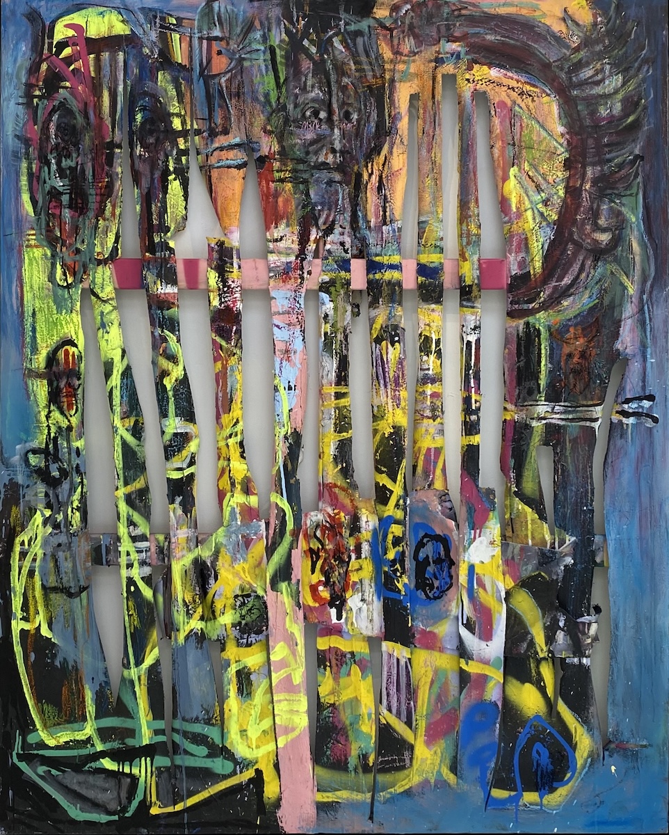 Man In Cross, 2022 Oil on Canvas, Spray Paint, Oil Stick, Charcoal, Canvas Cut-Outs, 48 x 60 inches