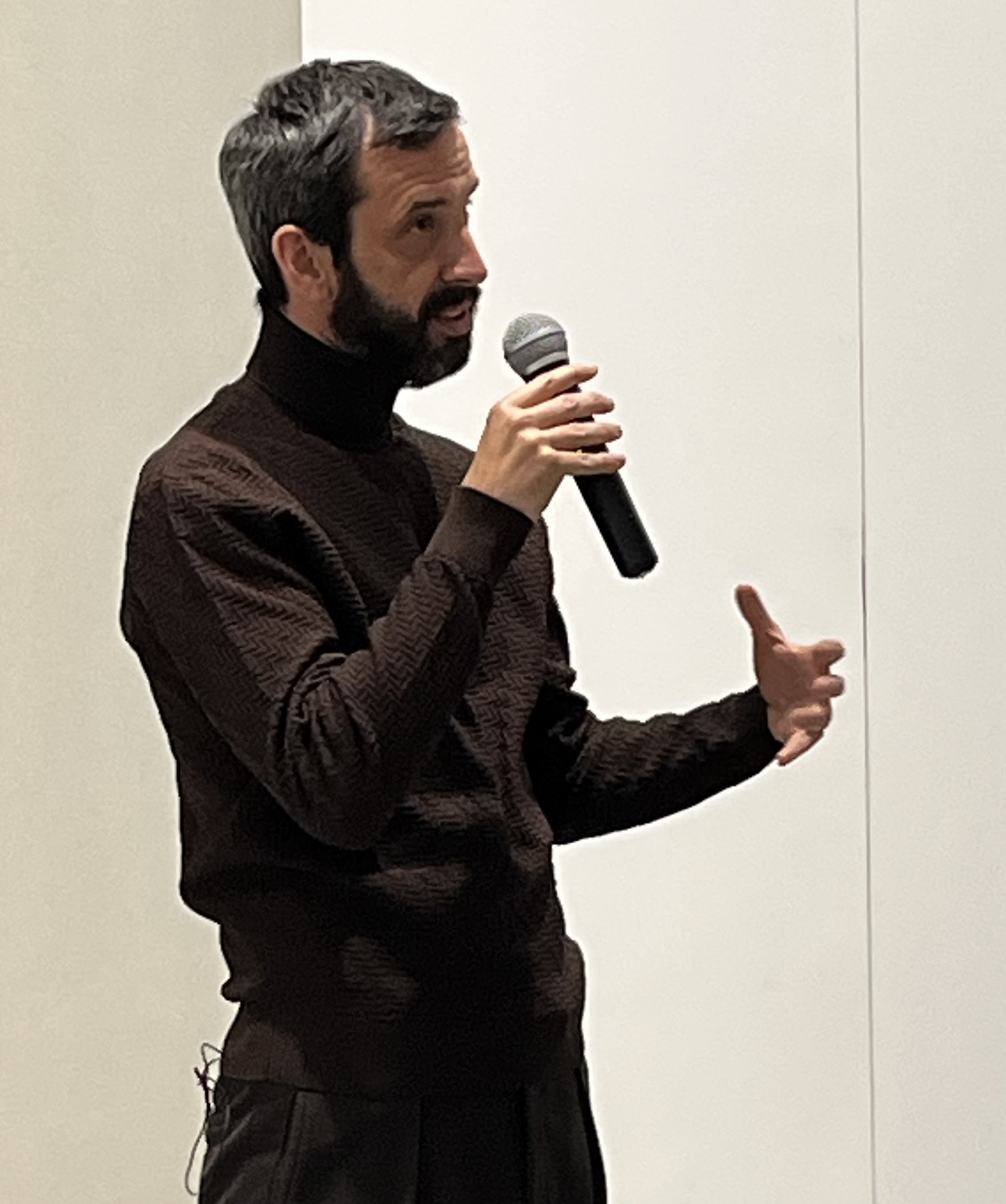 Curator Tobia Bezzola discusses the work of Franz Gertsch during a press walkthrough at Hause & Wirth. Photo by Lisa Freeman
