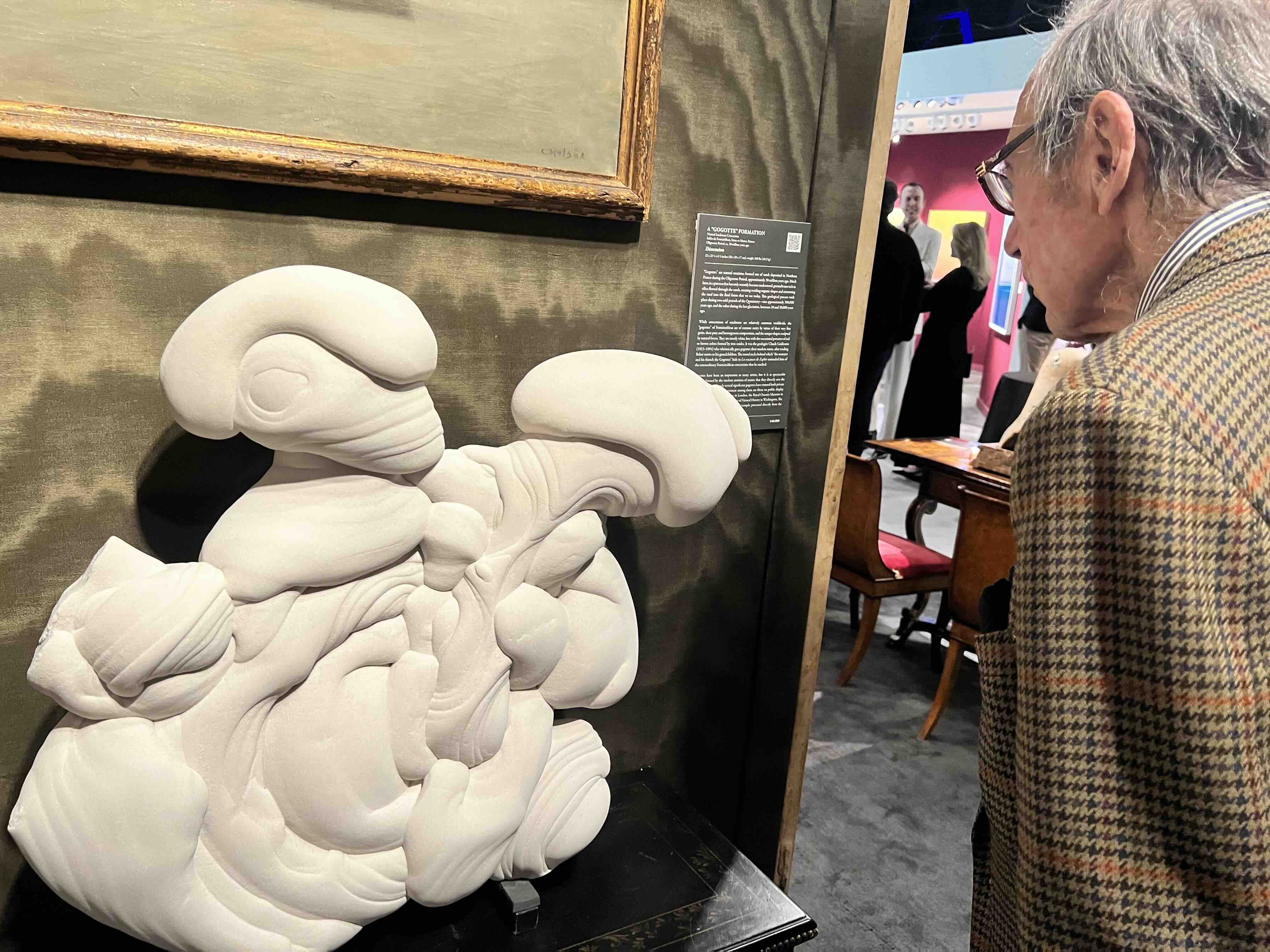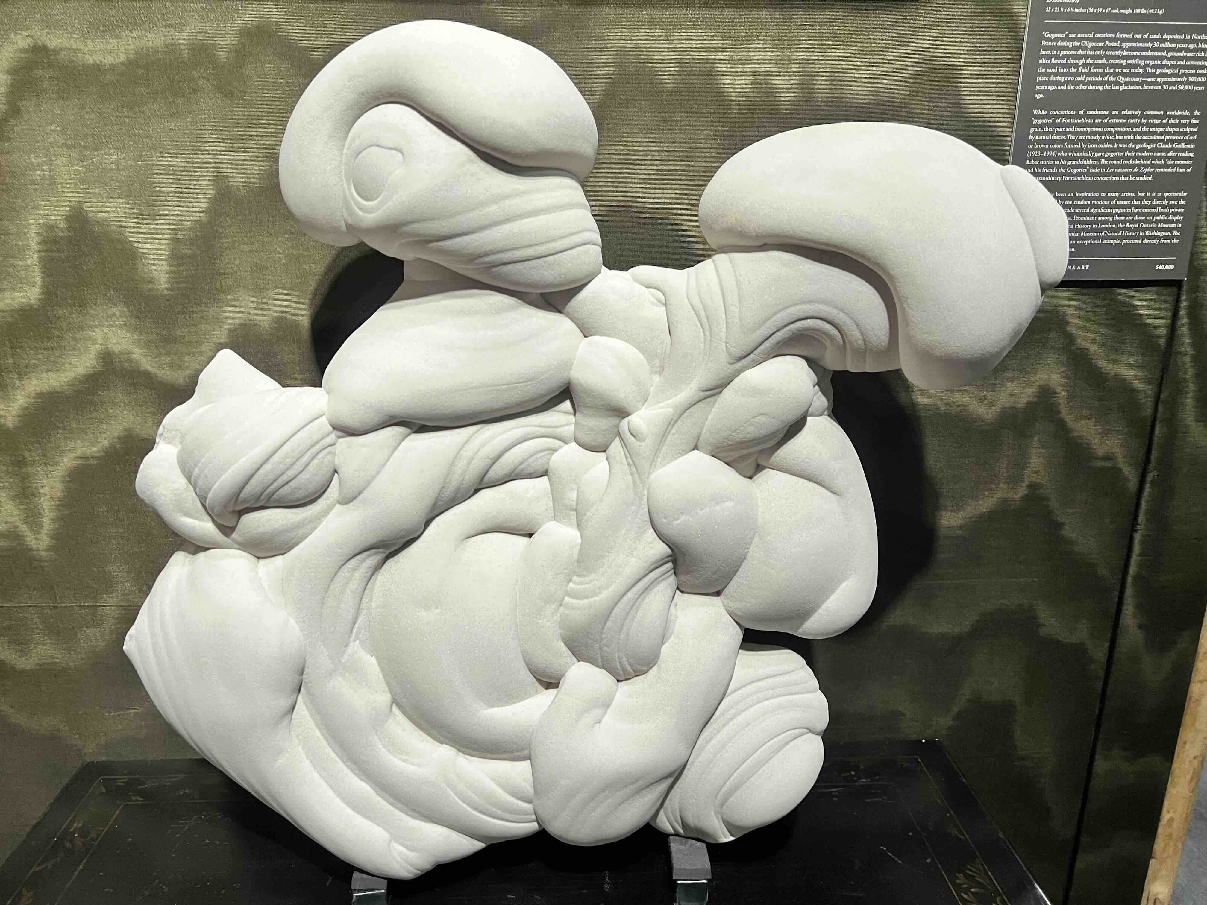 The stand of Robert Simon Fine Art, a dealer on Manhattan’s Upper East Side, for instance, was an exemplary mix. It was big on the Italian Renaissance, including work by Paolo Uccello and Giorgio Vasari, better known as the writer of the first essential art book, The Lives of the Artists, and it also presented a Gogotte, a boulder-sized chunk of white sandstone that appears to be an elaborately carved abstraction. It isn’t. Gogottes were formed from sand in France during the Oligocene period thirty million years ago, then re-formed thousands of years ago by silica-loaded groundwater that twice surged through the sand. Louis XIV, the Sun King, greatly admired gogottes and his LANDSCAPE architect, Andre Le Notre, used some in Versailles. A perfect add for the Winter Fair.