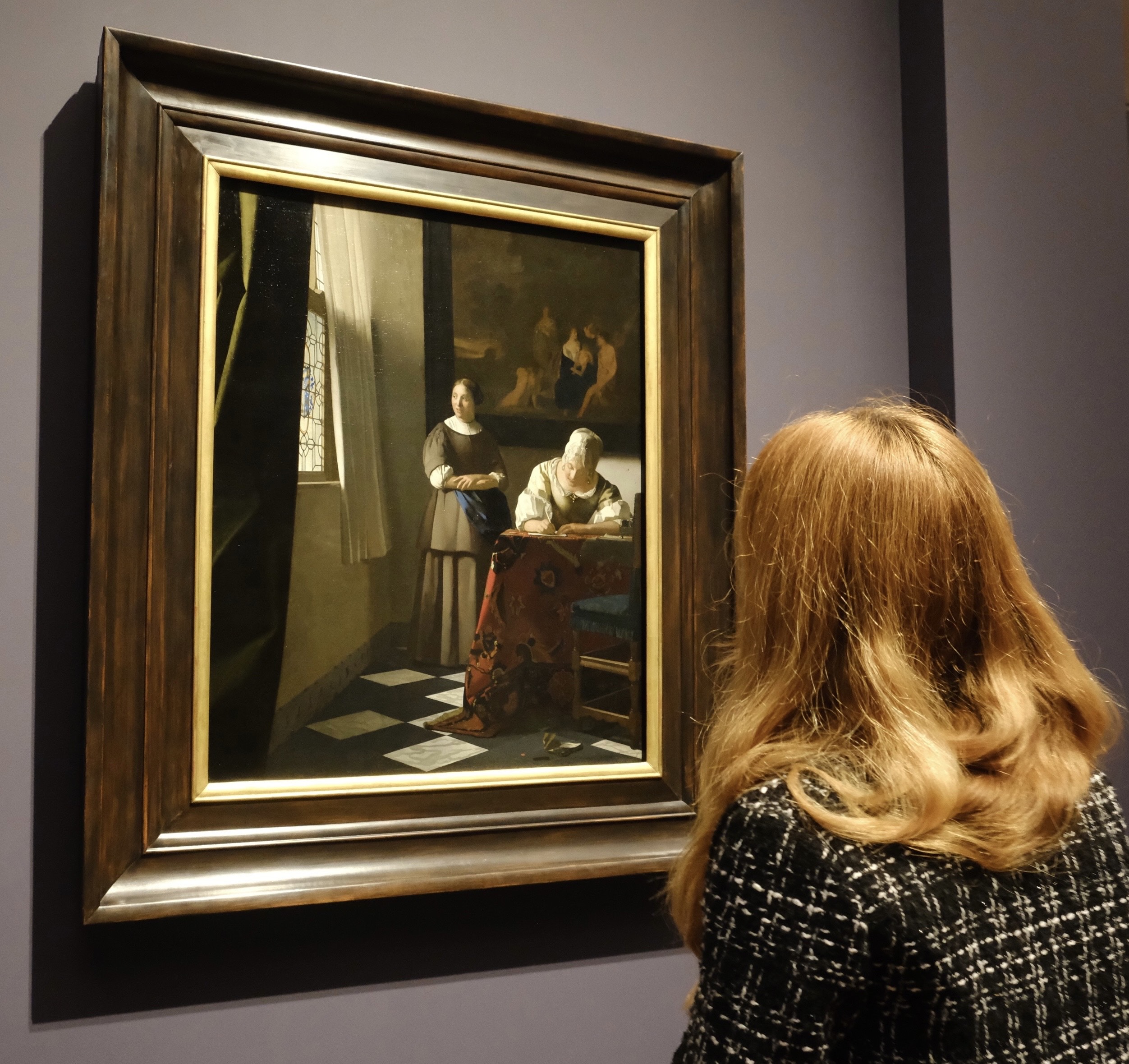 A woman gets a close look at Woman Writing a Letter With Her Maid, on loan from the National Gallery of Ireland. Photo by Jamie Lubetkin