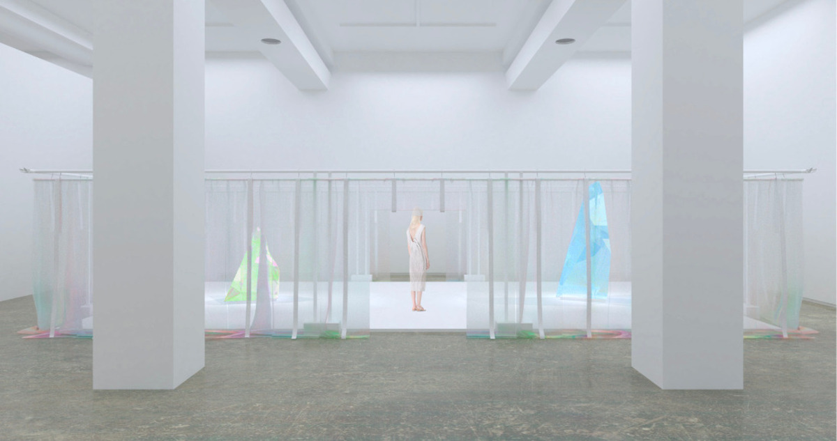 Mariko Mori (Japanese, b. 1967), Shrine, 2025, silk, aluminum, wood, two Dichroic coated acrylic sculptures, Corian bases. Approx. 74 13/16 x 362 3/16 x 189 inches / 190 x 920 x 480 centimeters. Image courtesy of Sean Kelly Gallery.