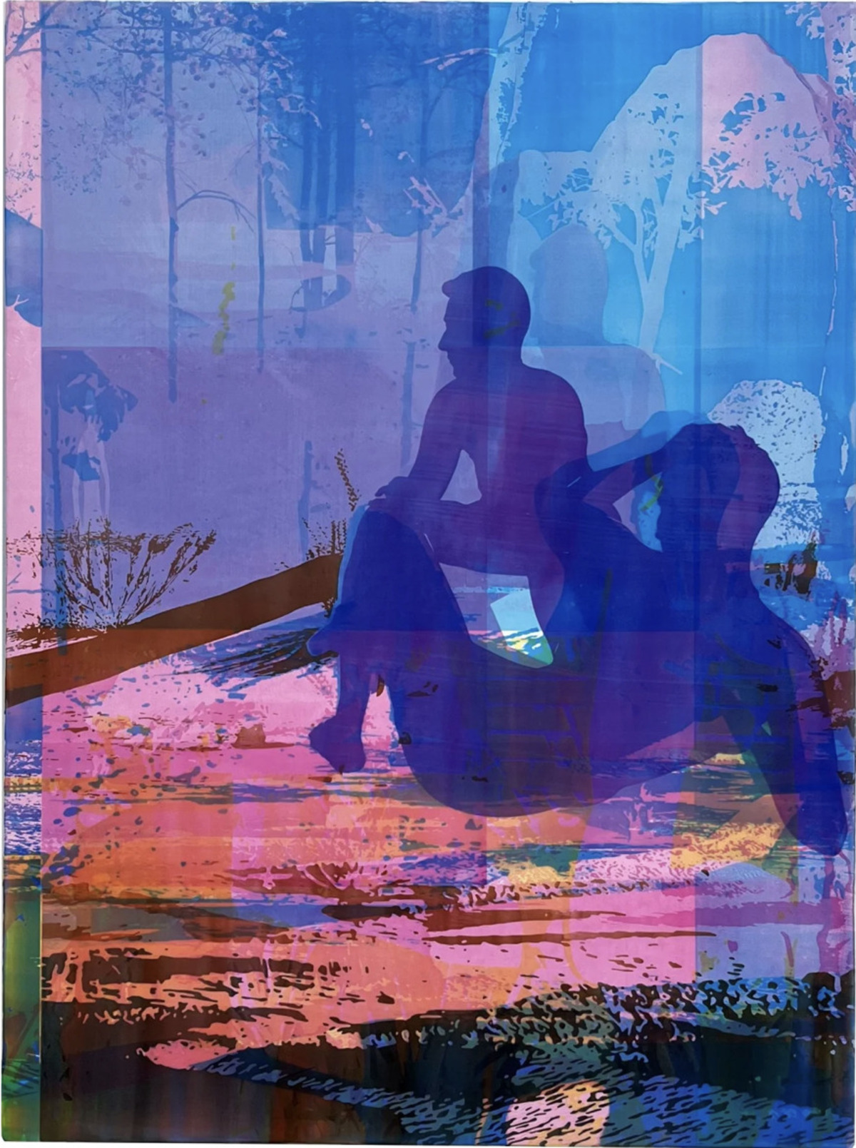The fruits of Walsh’s creative labors amounts to a spectrally bounteous collection of images brimming with an impassioned vitality. Nude silhouettes of youthful figures gather and relax in the rays of idealized nature, represented in overlapping transparent layers in tonally varied shades of non-localized colors. It’s important to keep changing your vantage points when observing Walsh’s paintings because this interaction will not only make you more attuned to the fastidiousness of their detailing, but also to experience an illusory movement of the subjects such as the swaying of trees or the rustle of bushes.