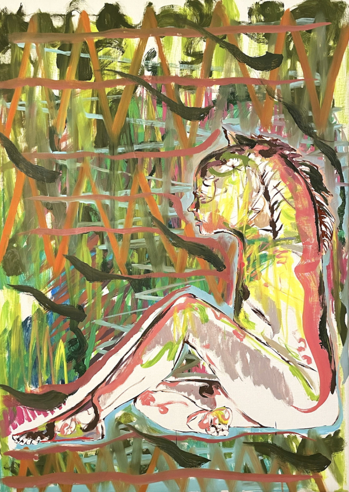Zoe Walsh (b. 1989, Washington, D.C.), Study A for in Our Eyes, On Our Tongues, 2023, acrylic on canvas-wrapped panel. 16 x 12 inches (40.5 x 30.5 cm). Image courtesy of Yossi Milo Gallery.