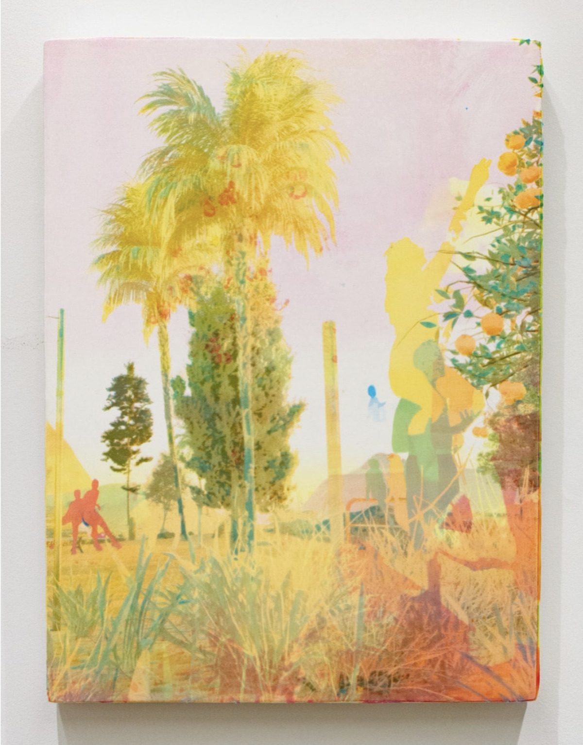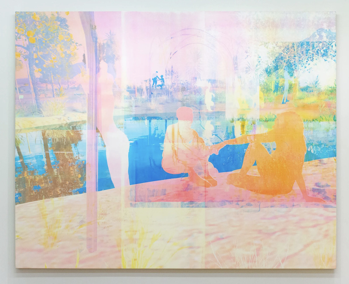 When you study the history of Western painting, scenes of amorous display often centralize a heterosexual gaze enmeshed within the aesthetic strictures of the academic landscape genre. Walsh went ahead and transformed this into a show of not only queer visibility, but queer reclamation. The figures are situated in a plane of reverie denoted by the tranquilly sensuous atmosphere overflowing in prismatic illuminations. Their bodily gestures, too, reveal a sense of liberation - a lone figure with a leg bent like an explorer as they gaze off into the distance, a man and a woman whose bodies affectionately coalesce within the branches of a tree, and multiple scenes of reposed daydreaming.