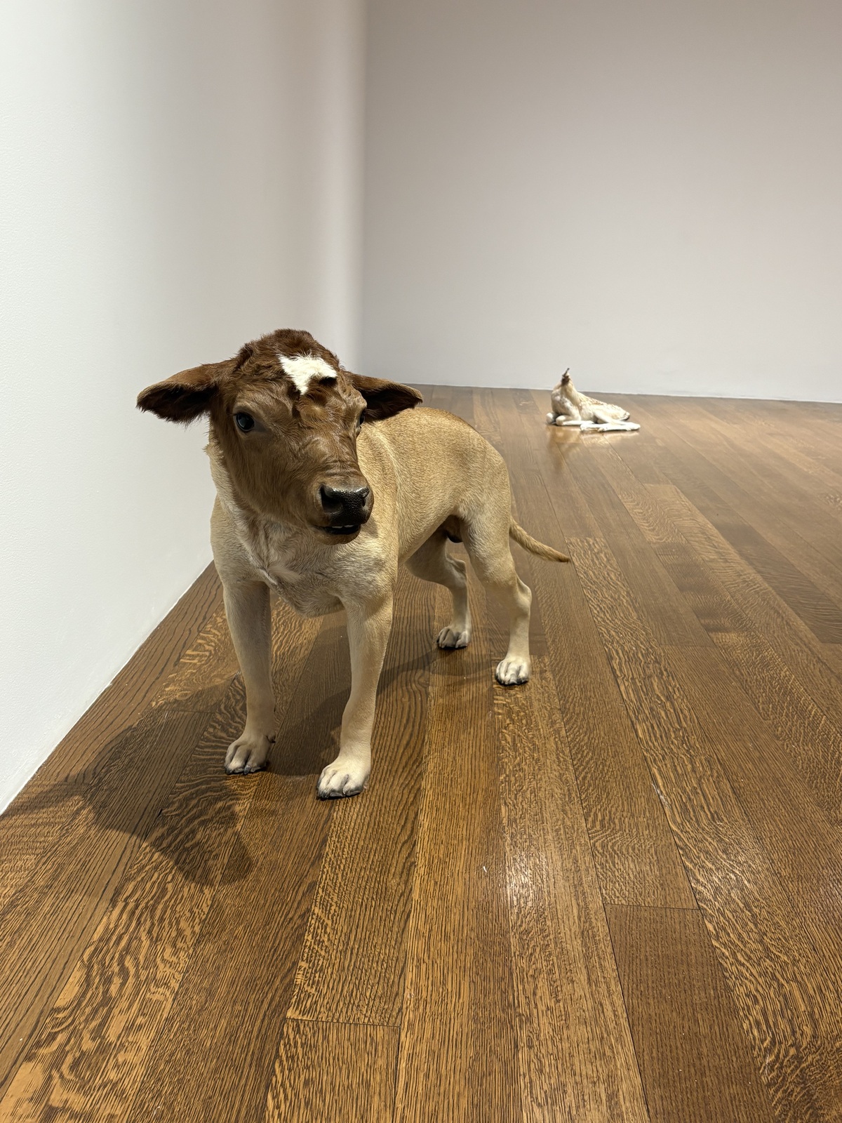 Thomas Grünfeld (German, b. 1956), Cow / Bull Mastiff, 2013, taxidermy. 29.5 x 35.4 x 13.8 inches / 75 x 90 x 35 centimeters.