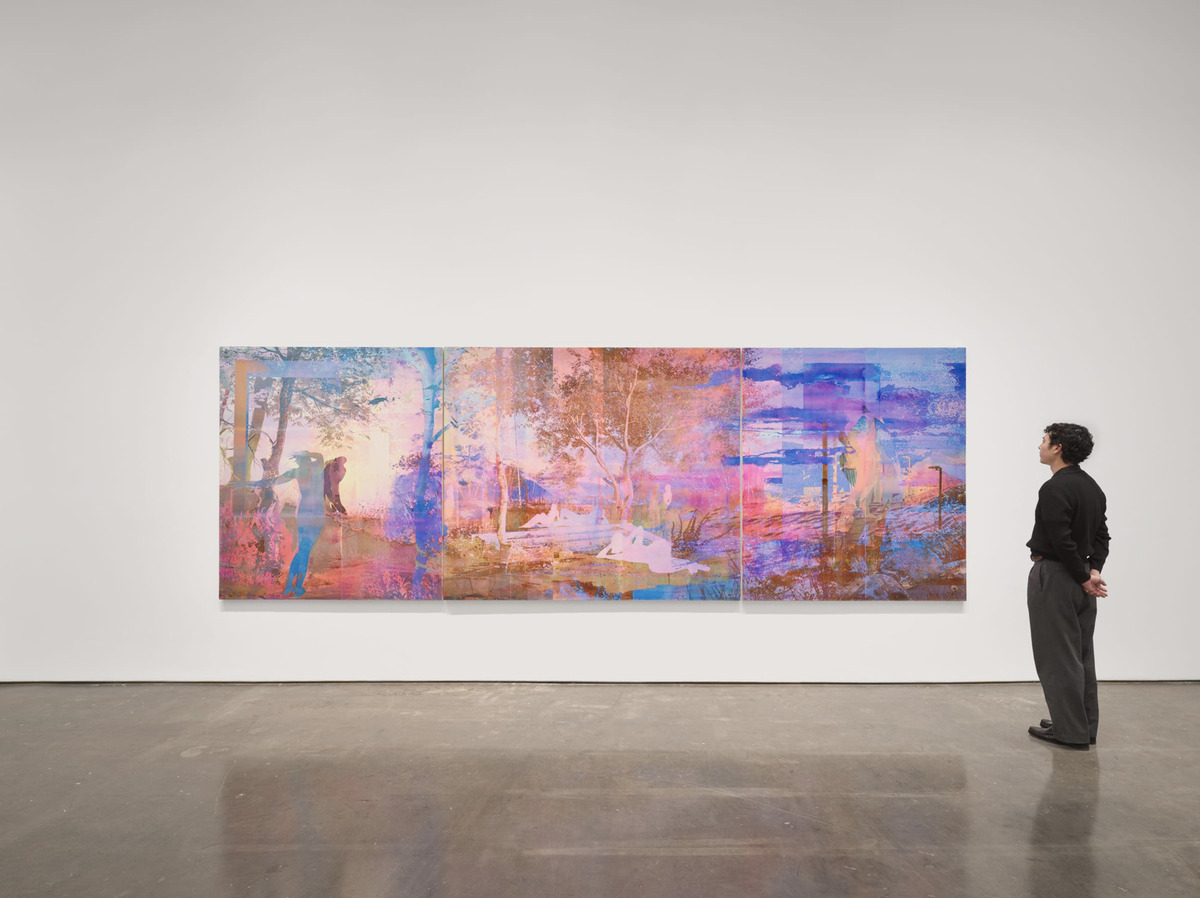 Yossi Milo’s press release gives an extremely thorough breakdown of Walsh’s creative process, but in sum, it is quite a dedicatedly laborious one entailing 3D modeling, elaborately staged photographic tableaux, research-based sourcing of archival materials, multiple layers of silkscreening, and painting.