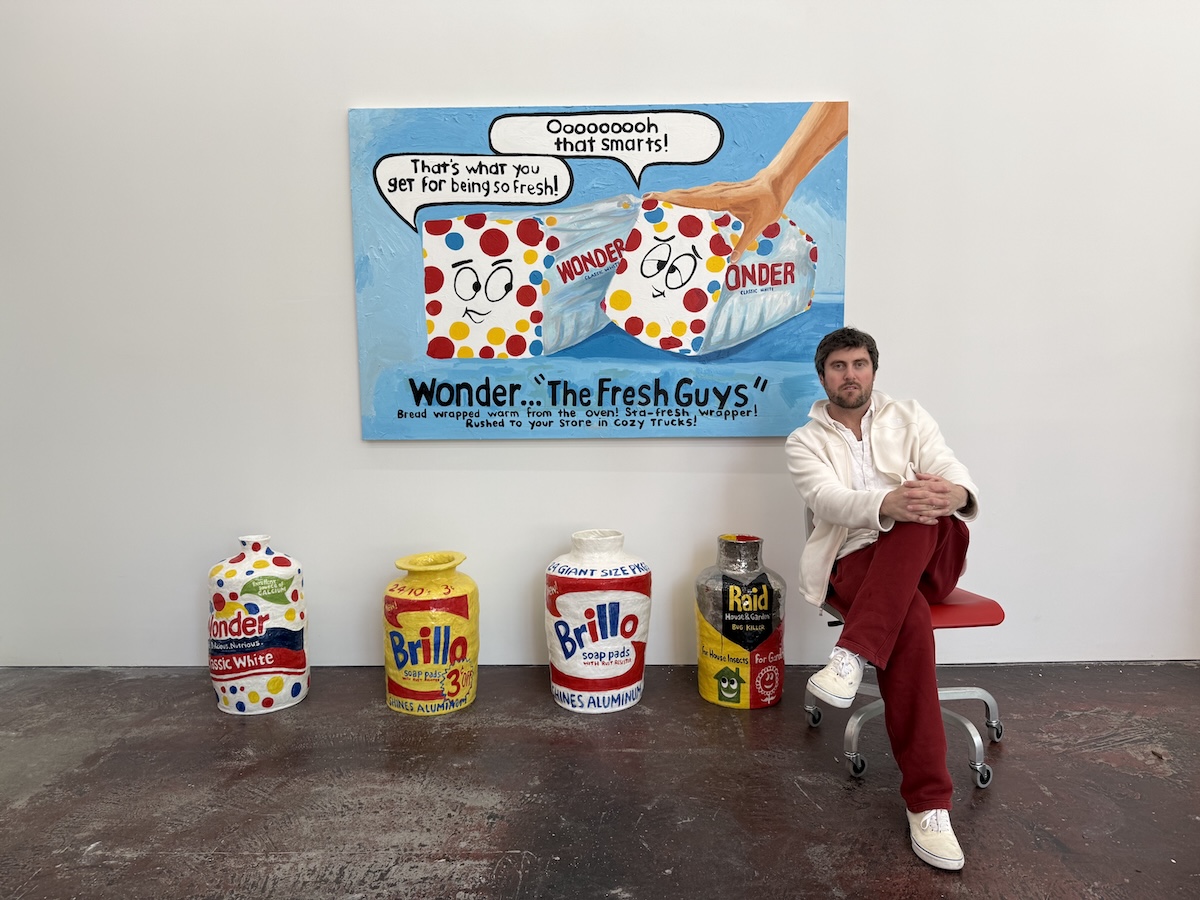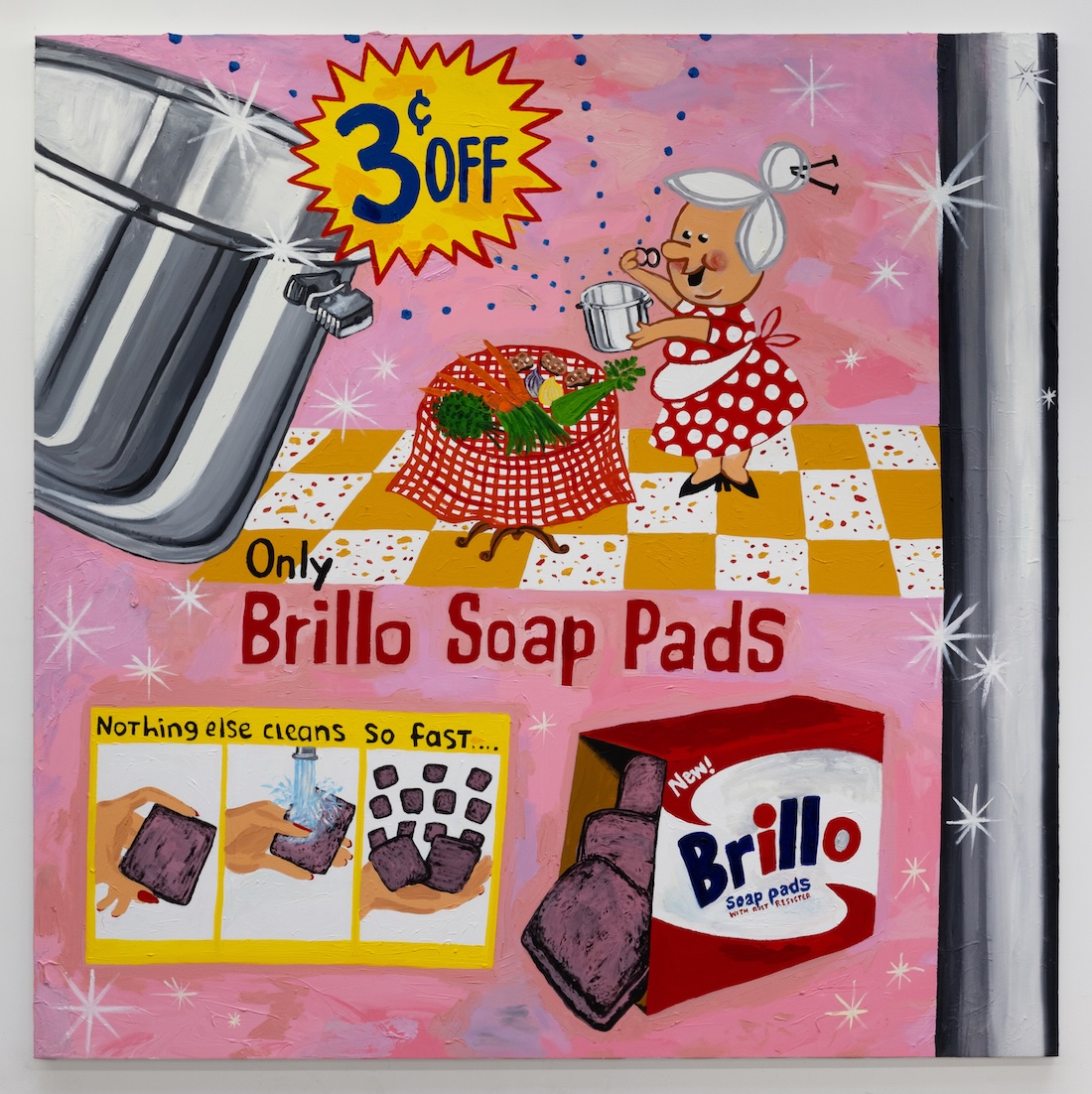Even though I’ve worked on ceramic, I call myself a painter more than a sculptor, because the majority of my work is actually painting. In this show, I wanted to go deeper and into more detail on the original idea that’s been inspiring my work. I'm really obsessed with American iconography: commercials, billboards, anything advertising-wise from the 50s and 60s. I remember going through many magazines and watching commercials from that time and wanting to make this the subject of my next show. For instance, I found these images of these Brillo soap pads, like [the character] Prudence Pots who’s feeding her cats and who kind of looks like a Flintstone character. I just found the iconography so playful and fascinating. I wanted to play around with those images and bring them back to life on a personal and much larger scale.